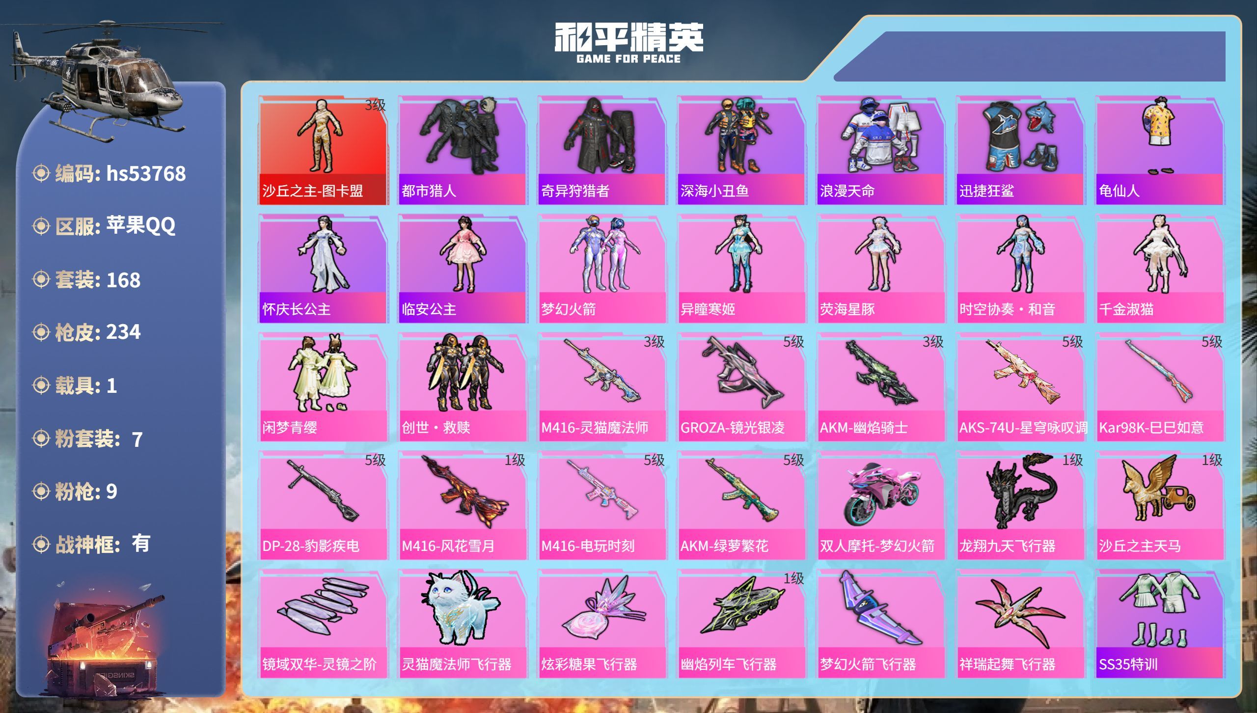 22王牌印记-有战神框-1红装-10粉装-14特效枪-2载具-113544热力值-235套装-323
