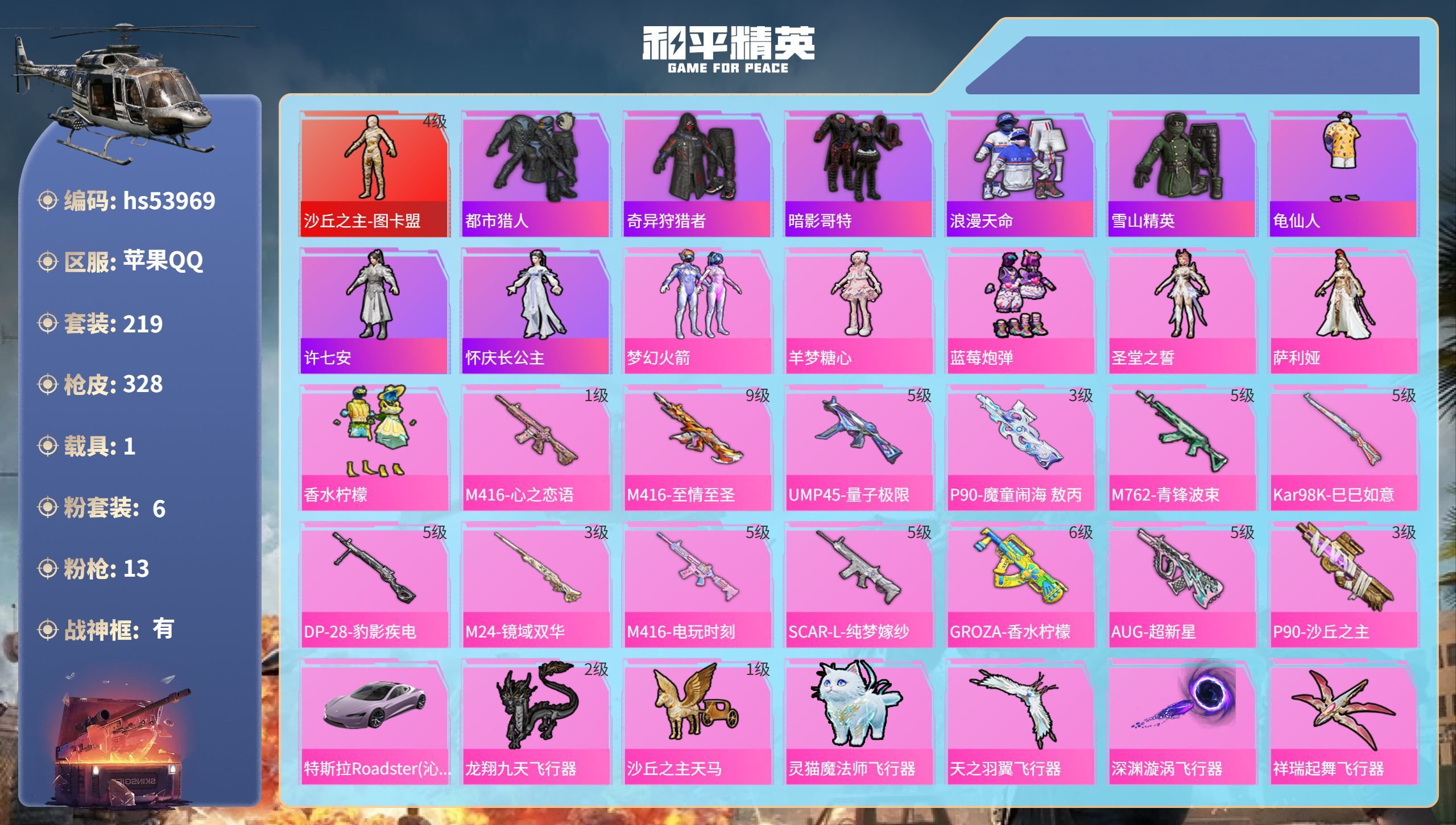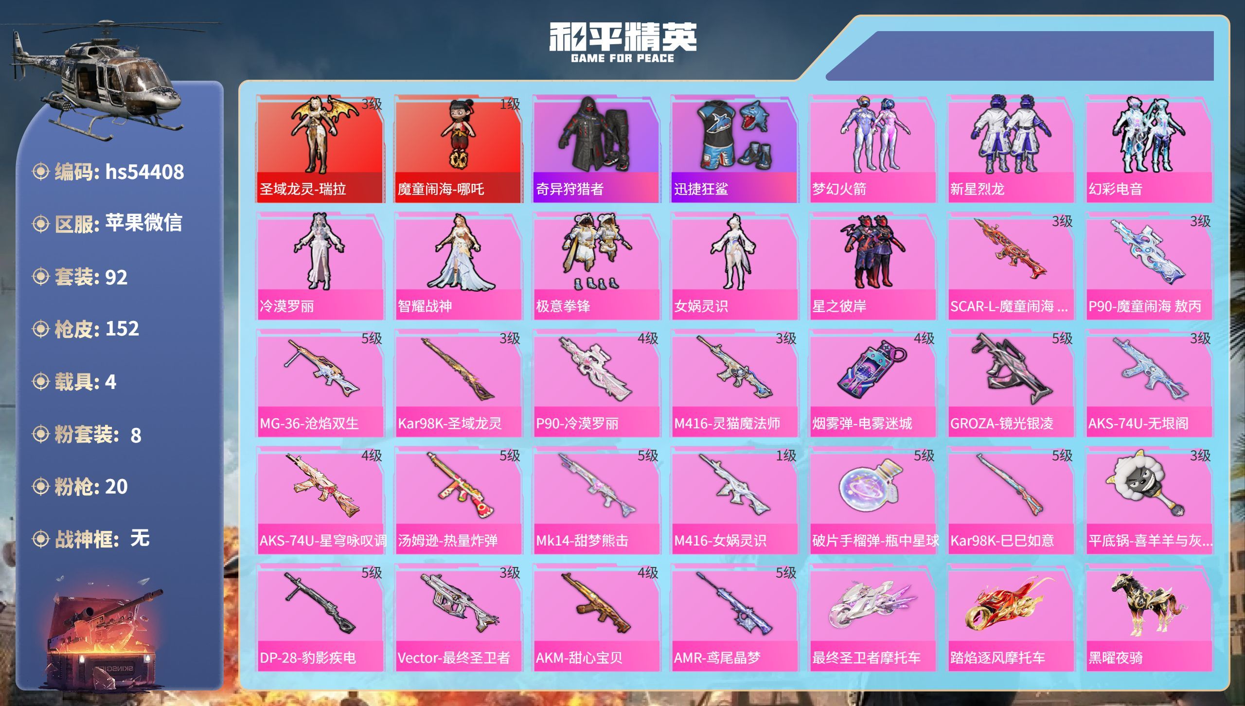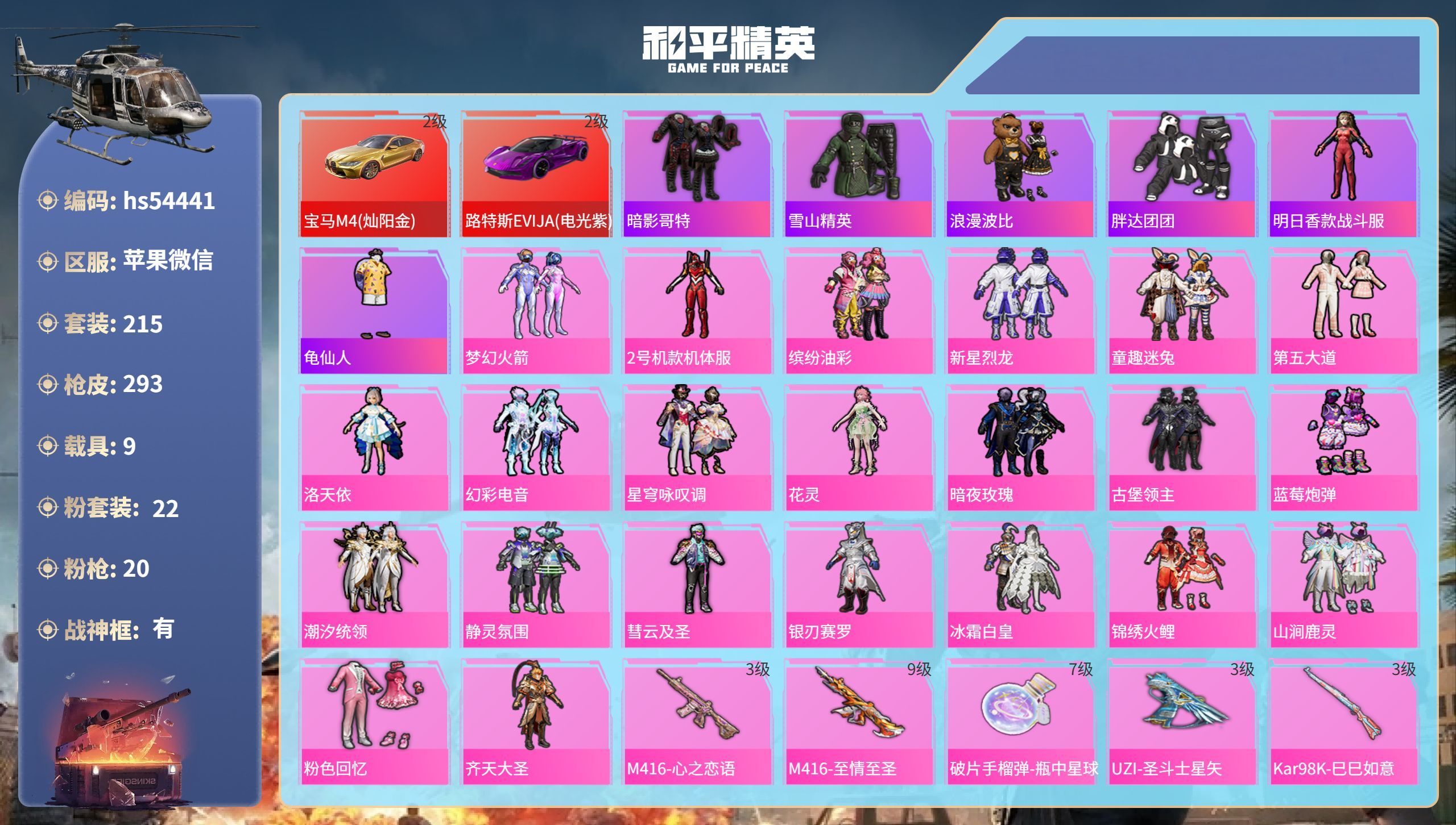 hs54441 苹果v-22王牌印记-有战神框-22粉装-20特效枪-9载具-139701热力值-