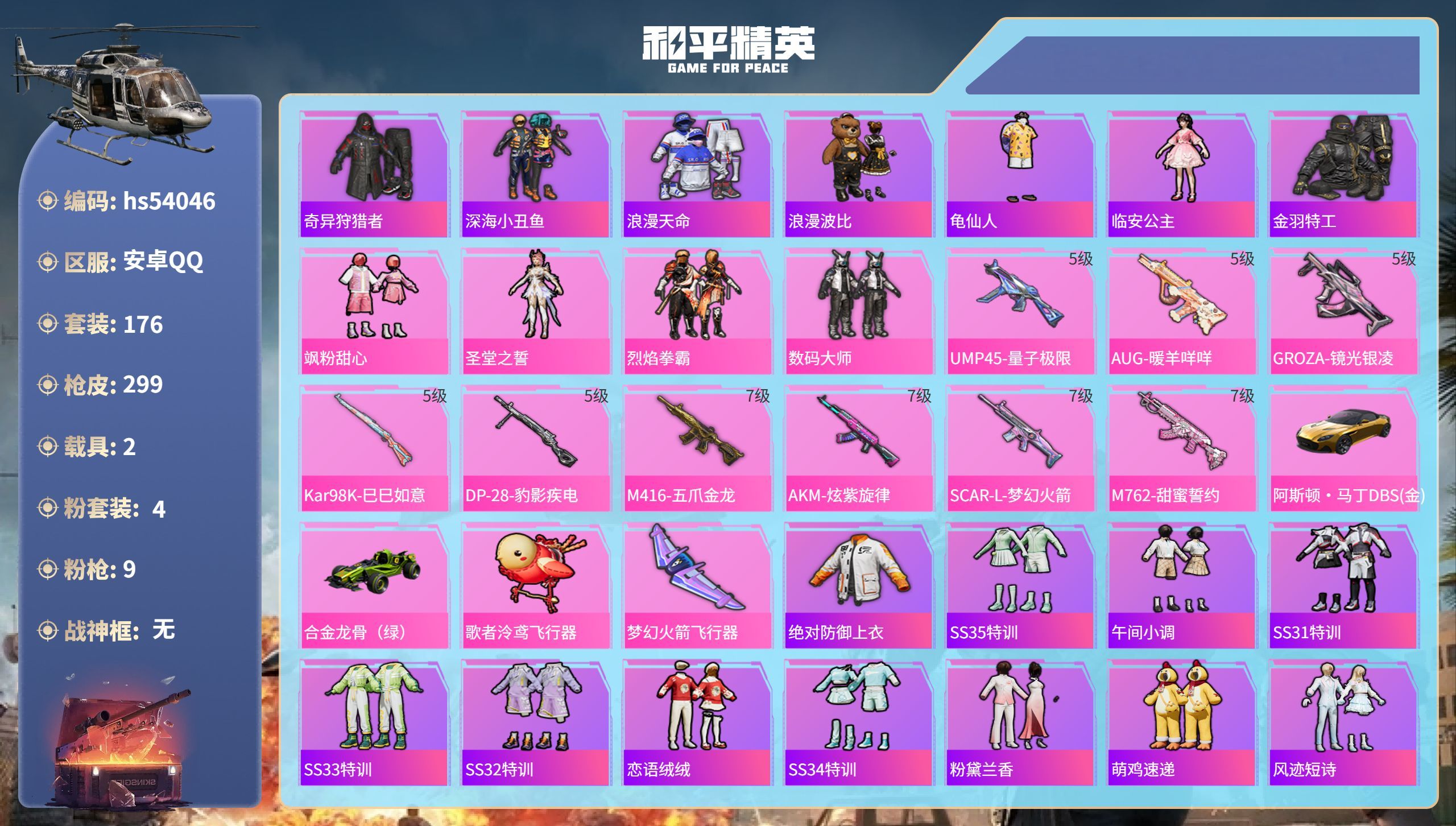 hs54046 安卓手Q-24王牌印记-4粉装-9特效枪-2载具-89962热力值-176套装-29
