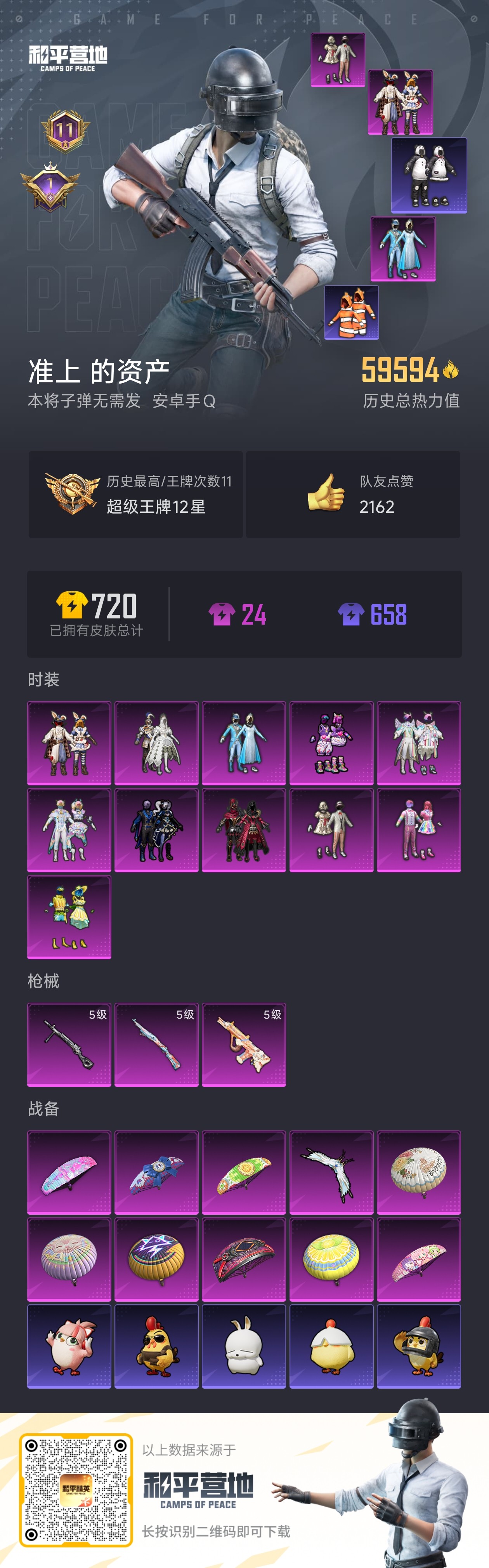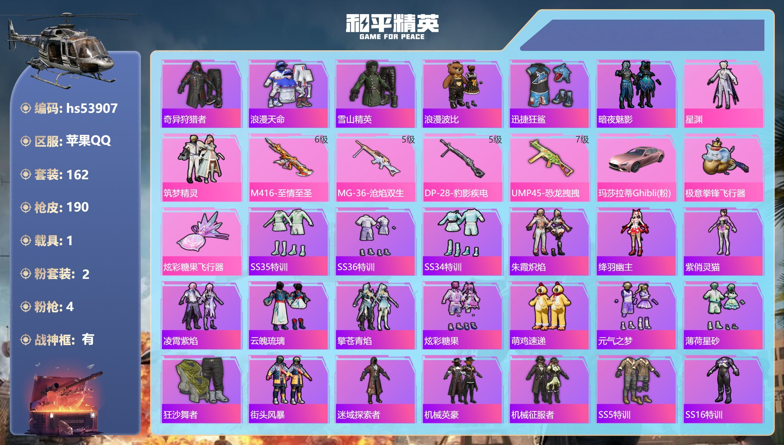 hs53920 苹果手Q-14王牌印记-有战神框-7粉装-4特效枪-54067热力值-159套装-1