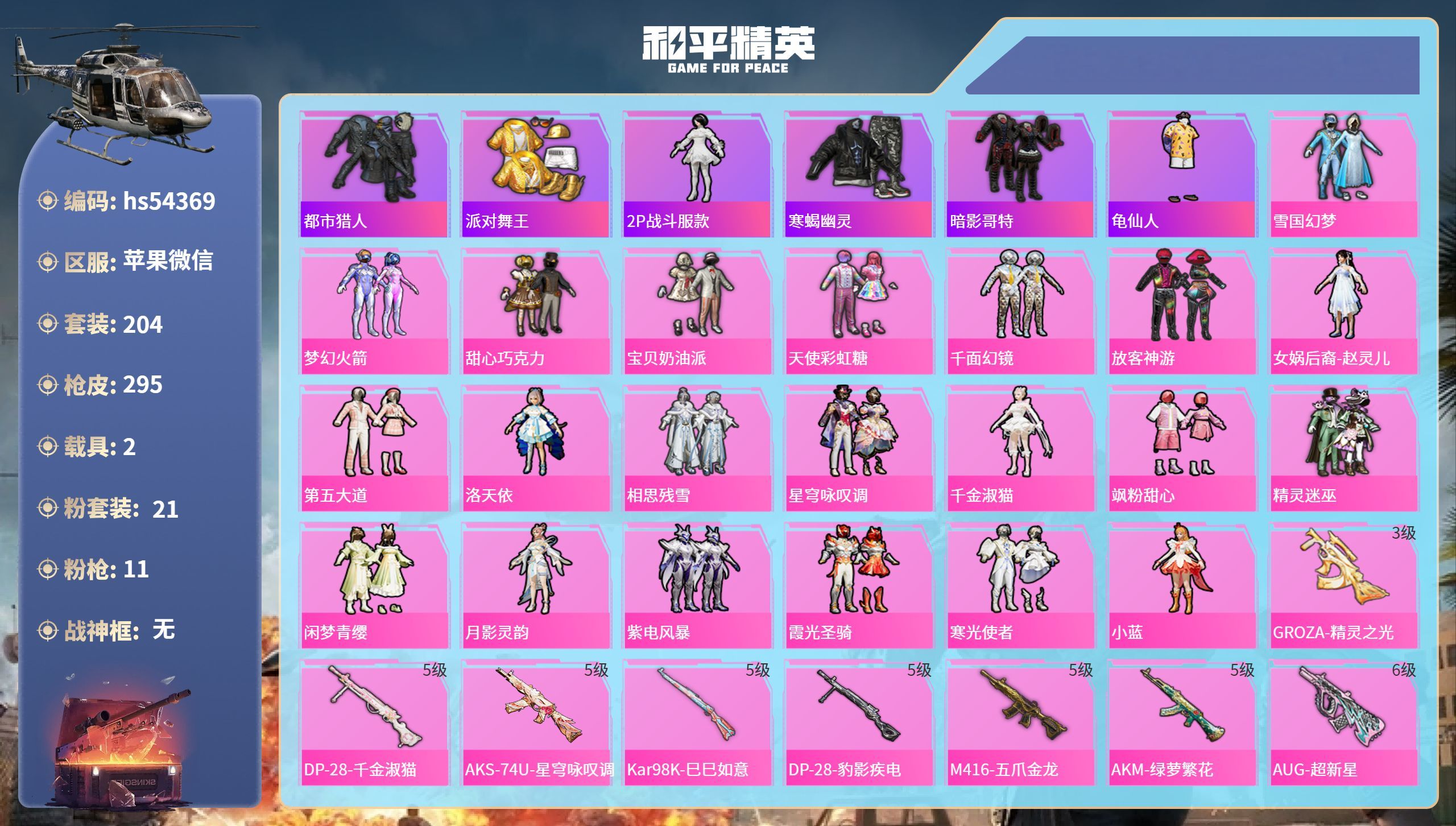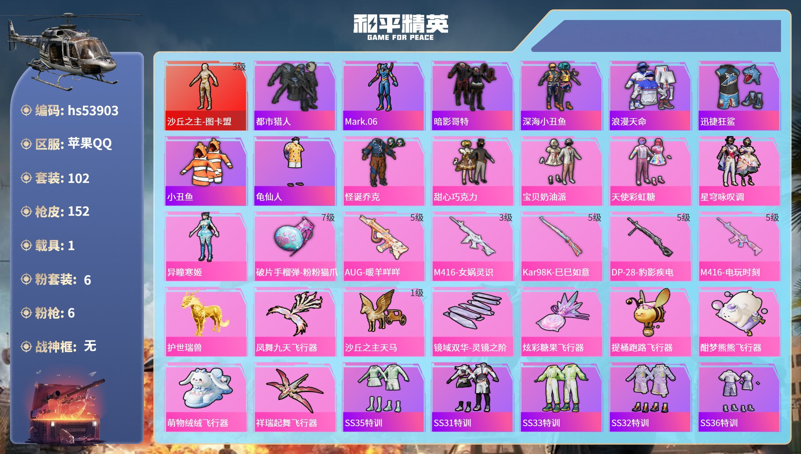 hs53855 苹果手Q-2王牌印记-2粉装-4特效枪-1载具-30200热力值-78套装-104枪