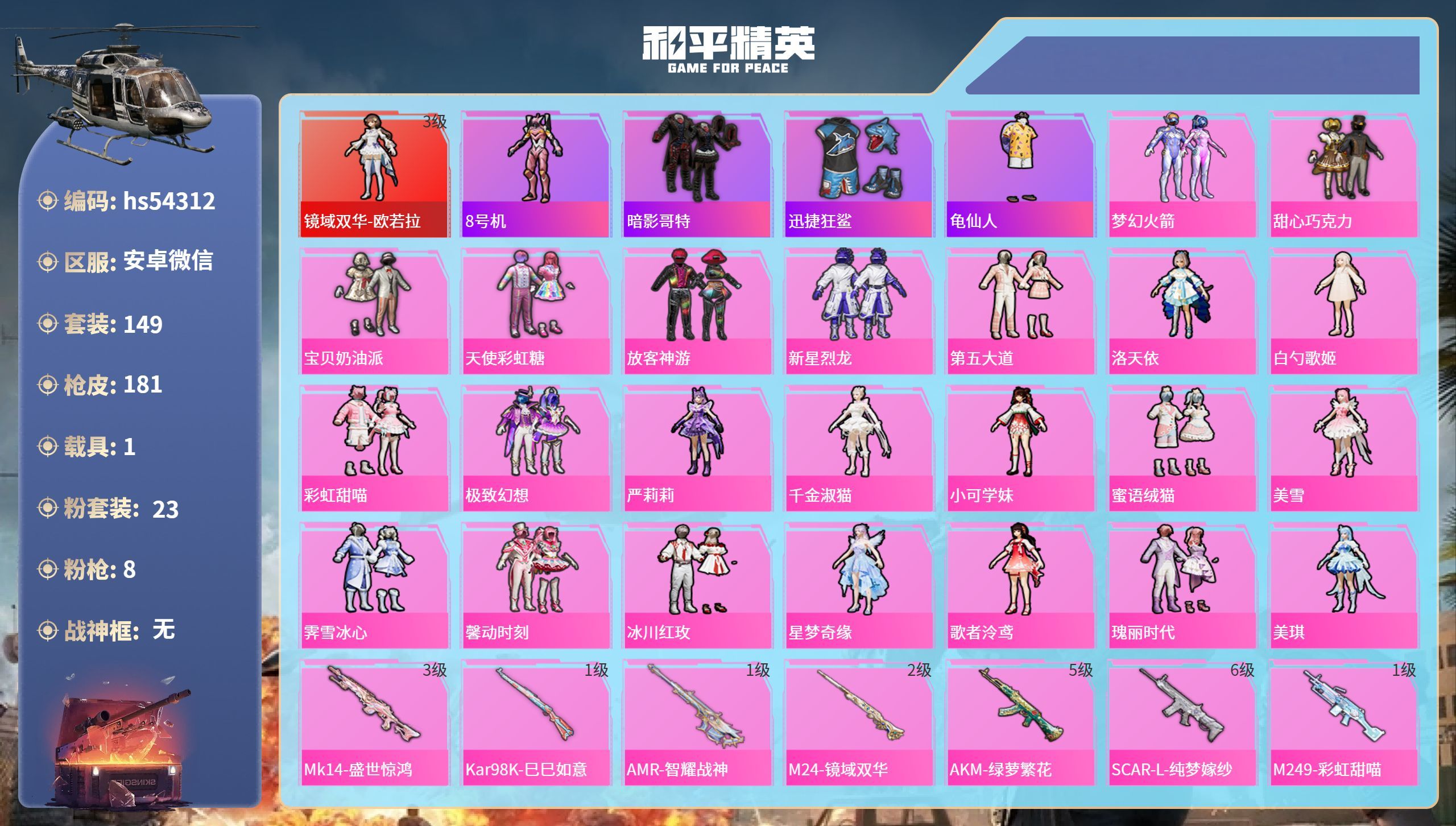 hs54225 安卓v-16王牌印记-12粉装-13特效枪-1载具-82770热力值-184套装-