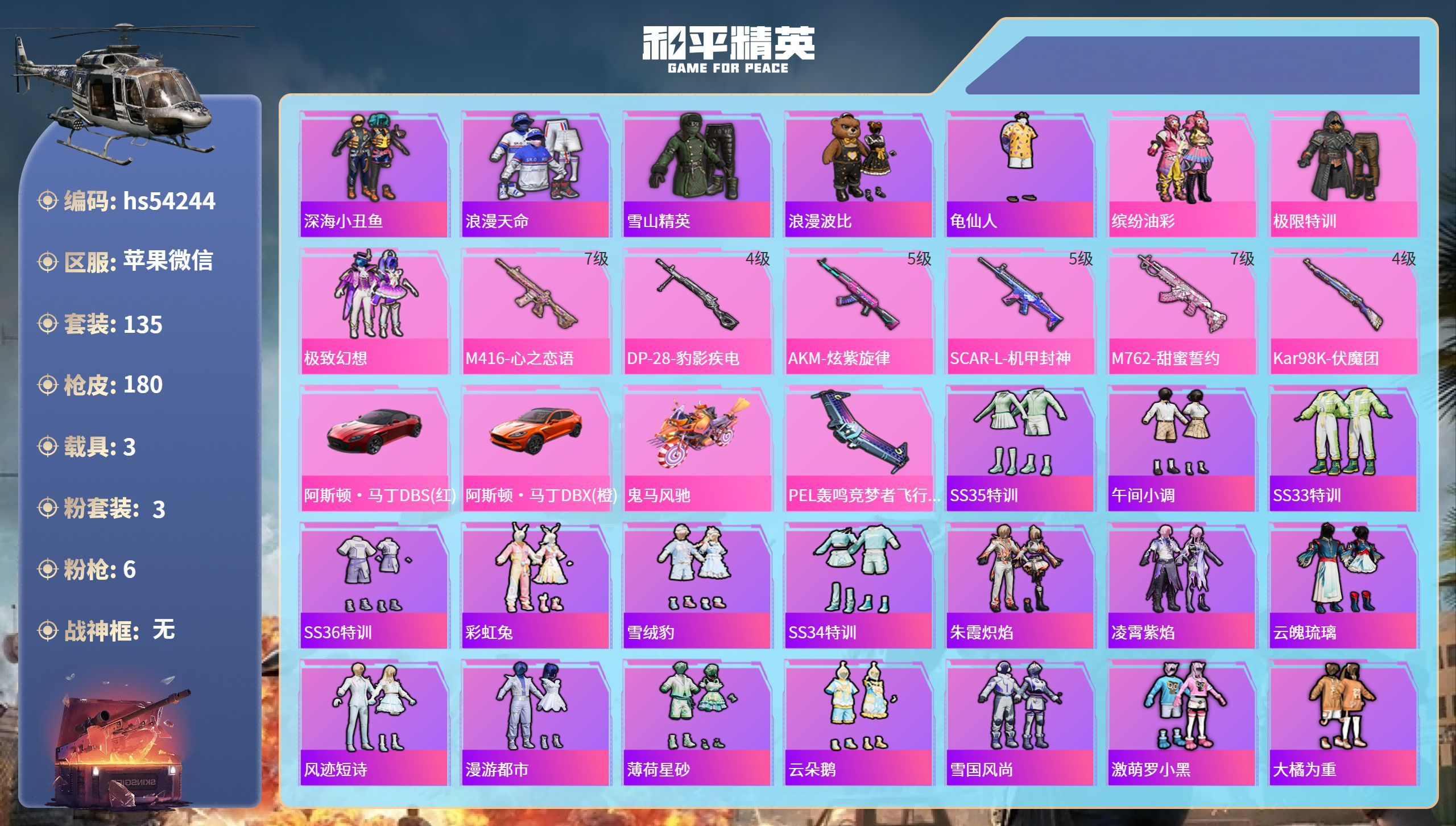 hs54244 苹果v-14王牌印记-3粉装-6特效枪-3载具-64532热力值-135套装-18