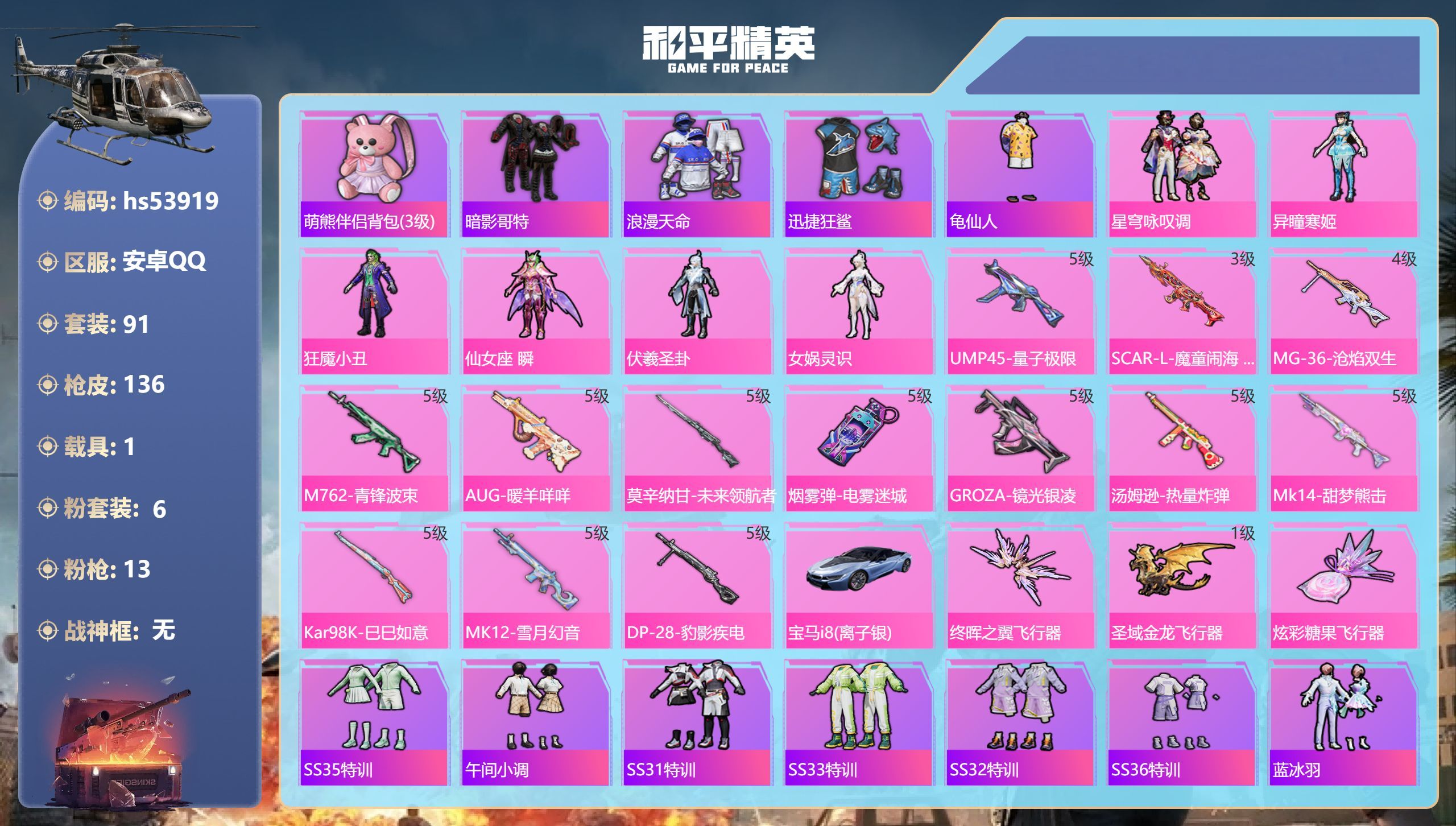hs53919 安卓手Q-6王牌印记-6粉装-13特效枪-1载具-44683热力值-91套装-136