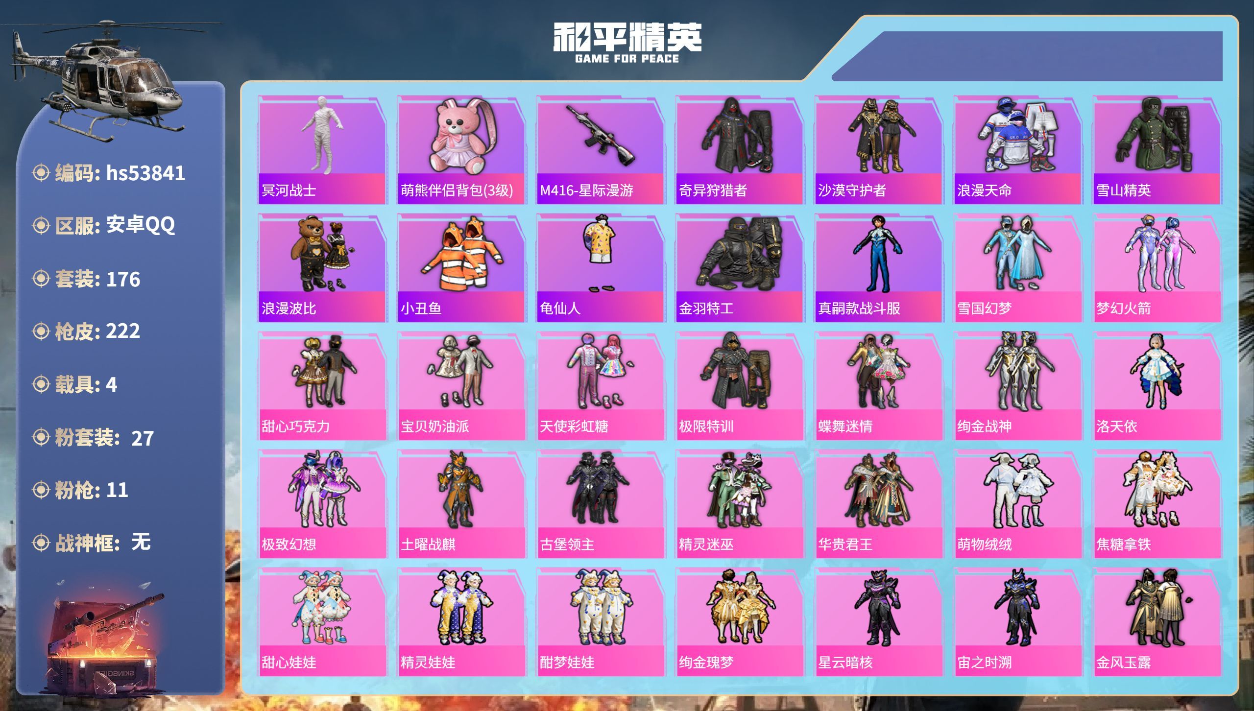 hs53841 安卓手Q-12王牌印记-27粉装-11特效枪-4载具-91334热力值-176套装-