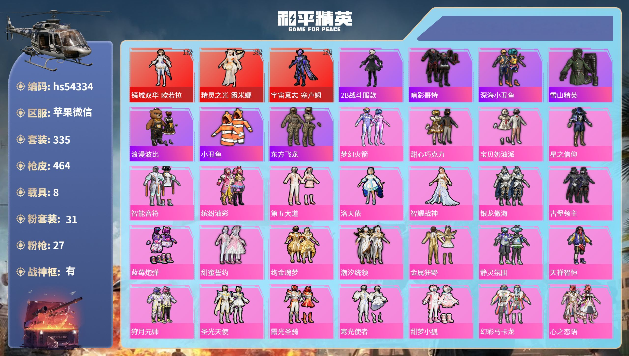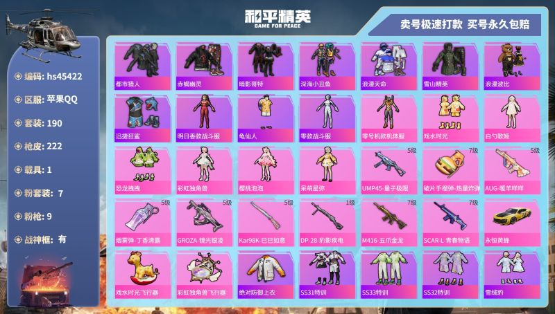 hs52826 苹果手Q-14王牌印记-9粉装-5特效枪-4载具-88042热力值-189套装-26