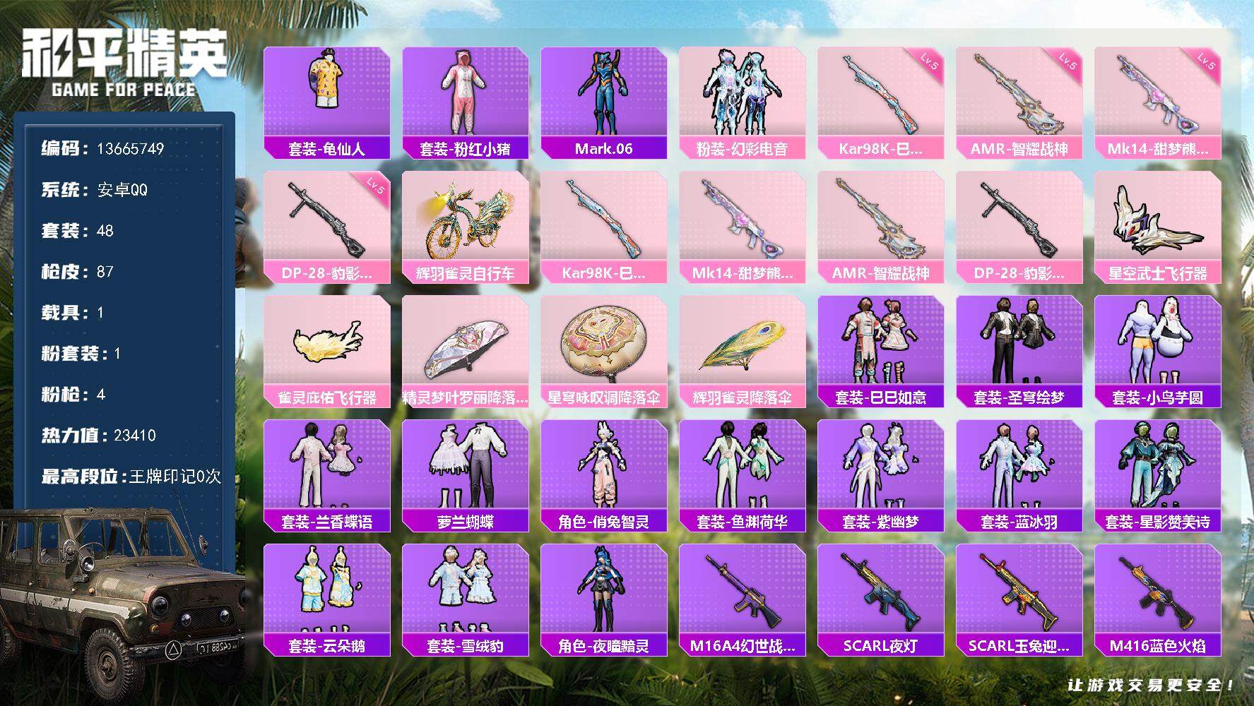 hs53917 安卓手Q-5王牌印记-4粉装-7特效枪-1载具-35301热力值-80套装-110枪