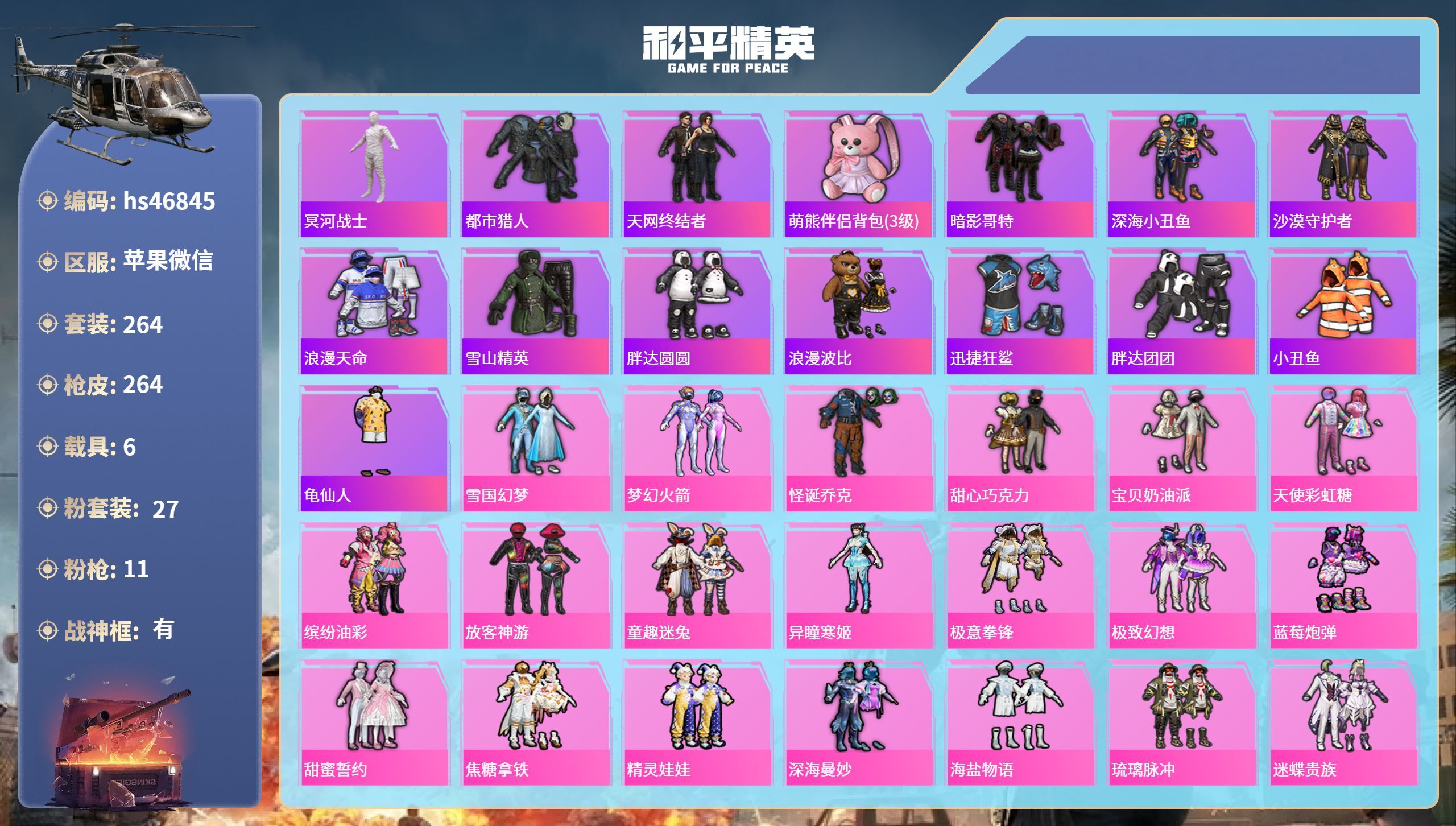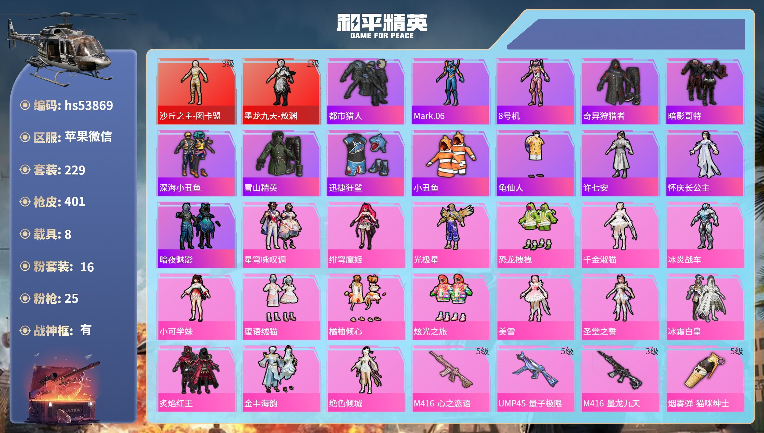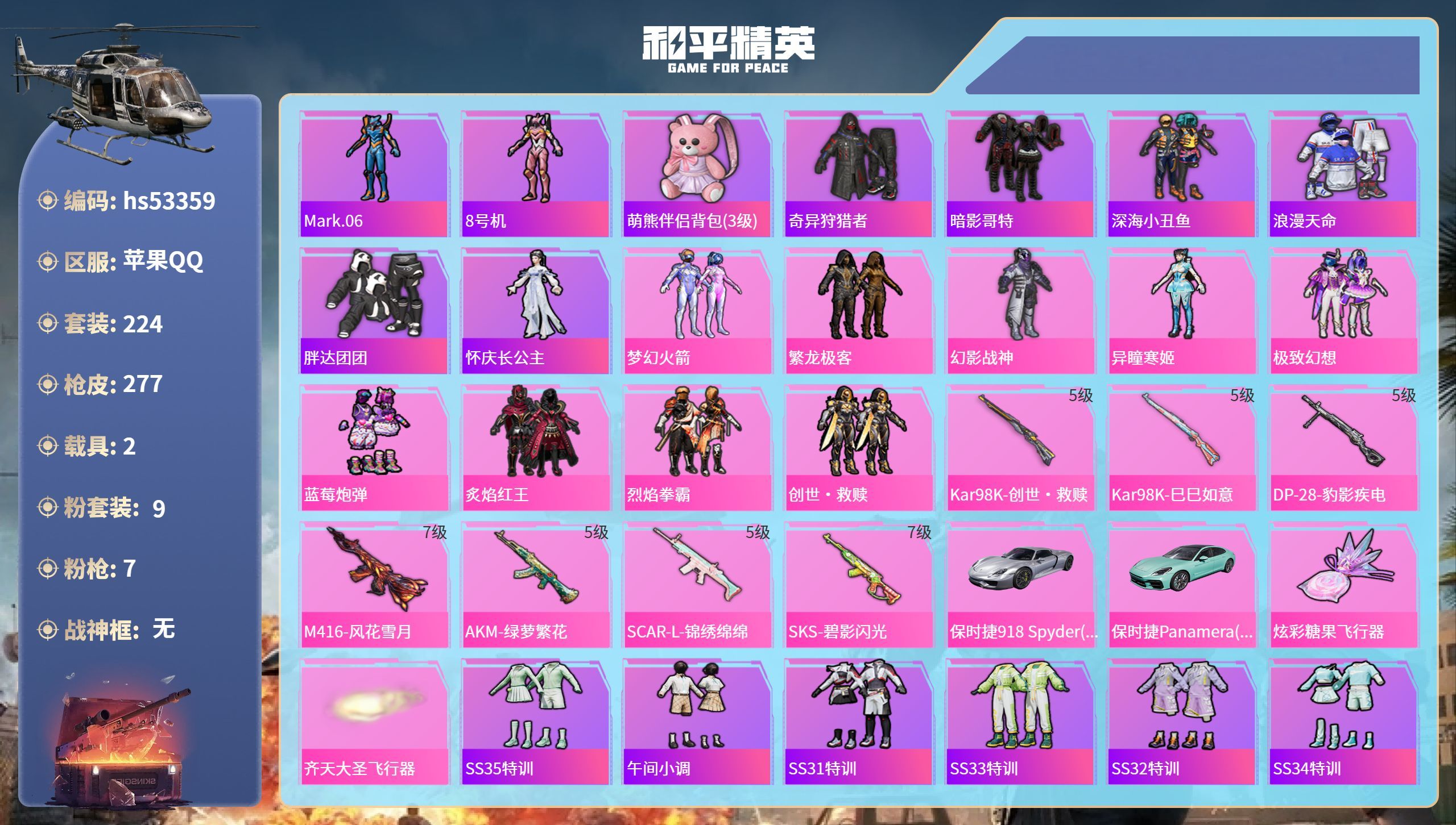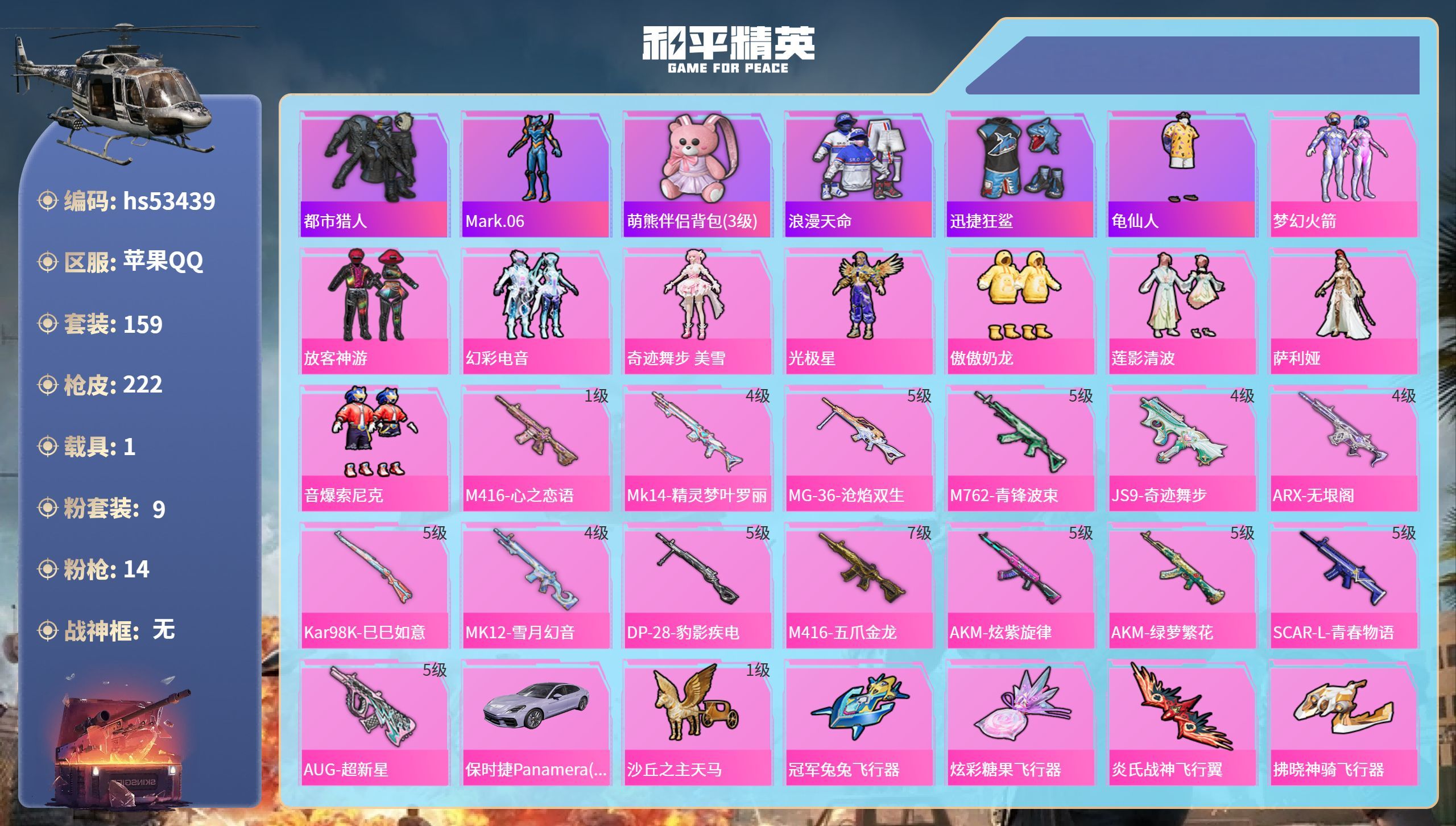 hs53439 苹果手Q-11王牌印记-9粉装-14特效枪-1载具-72190热力值-159套装-2