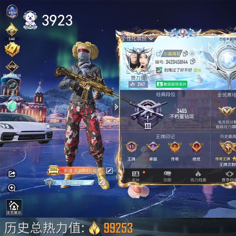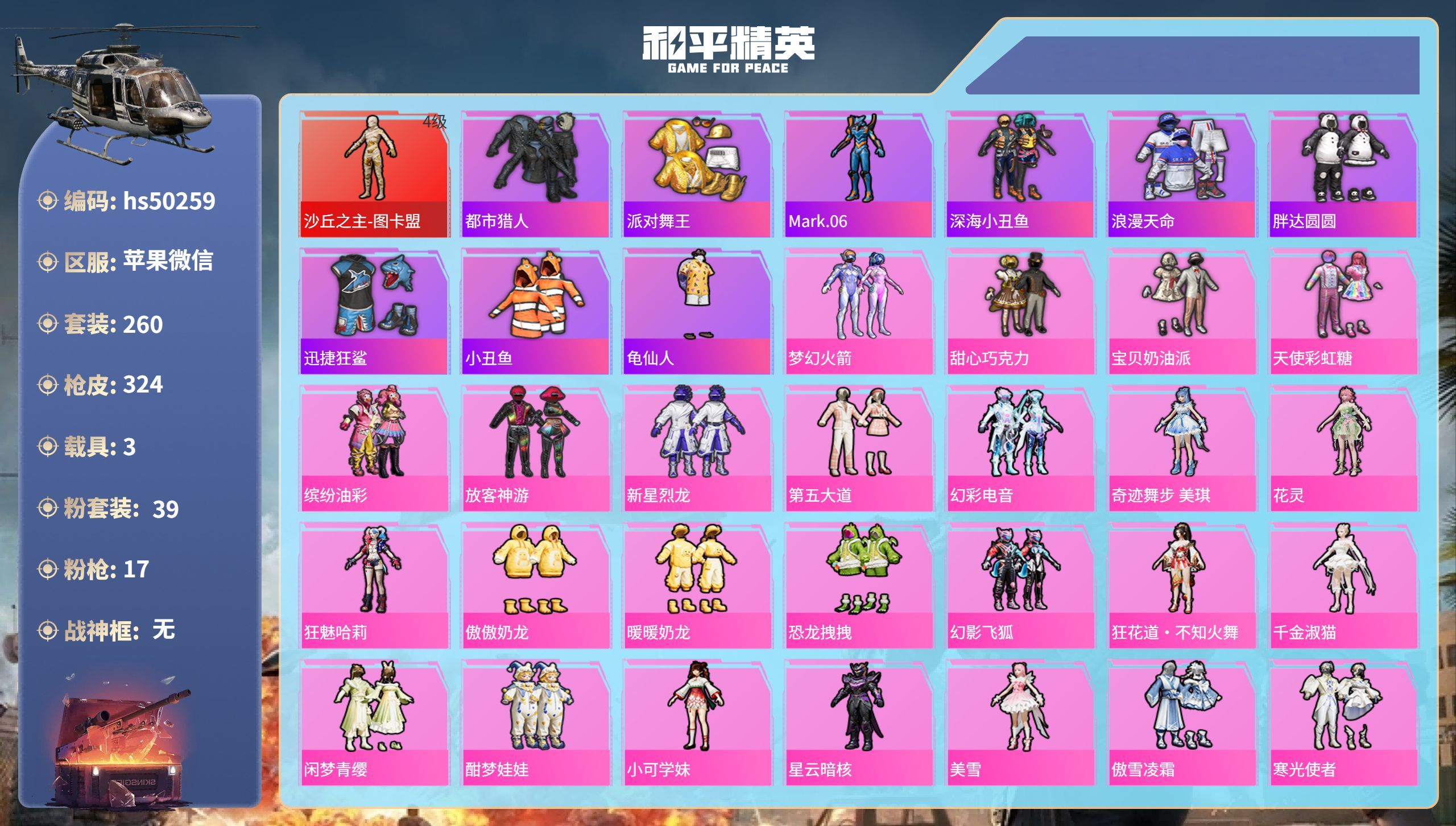 16王牌印记-1红装-39粉装-17特效枪-3载具-124698热力值-260套装-324枪皮-7卓