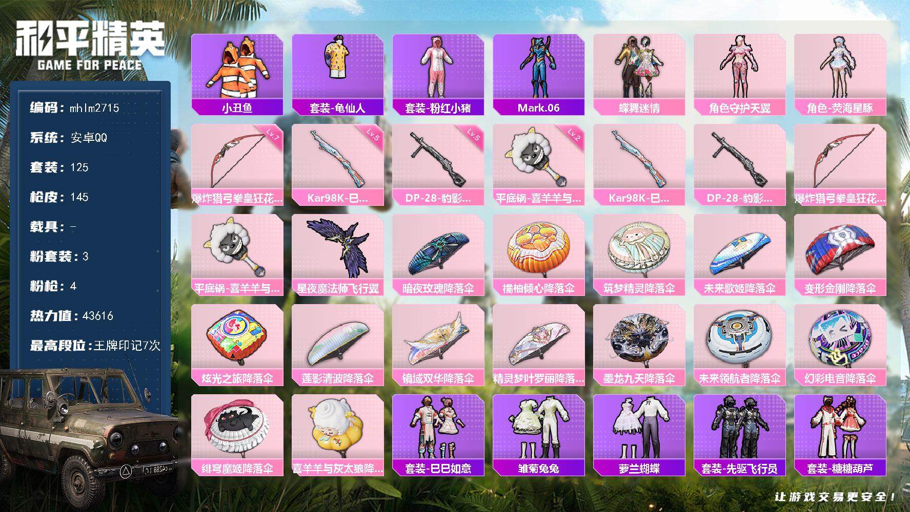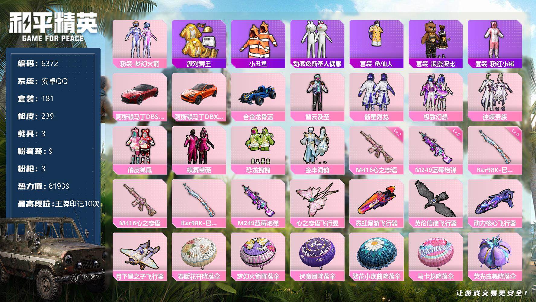 安卓 手Q-6粉装-4特效枪-0载具-0粉色飞行器-31495热力值-8王牌印