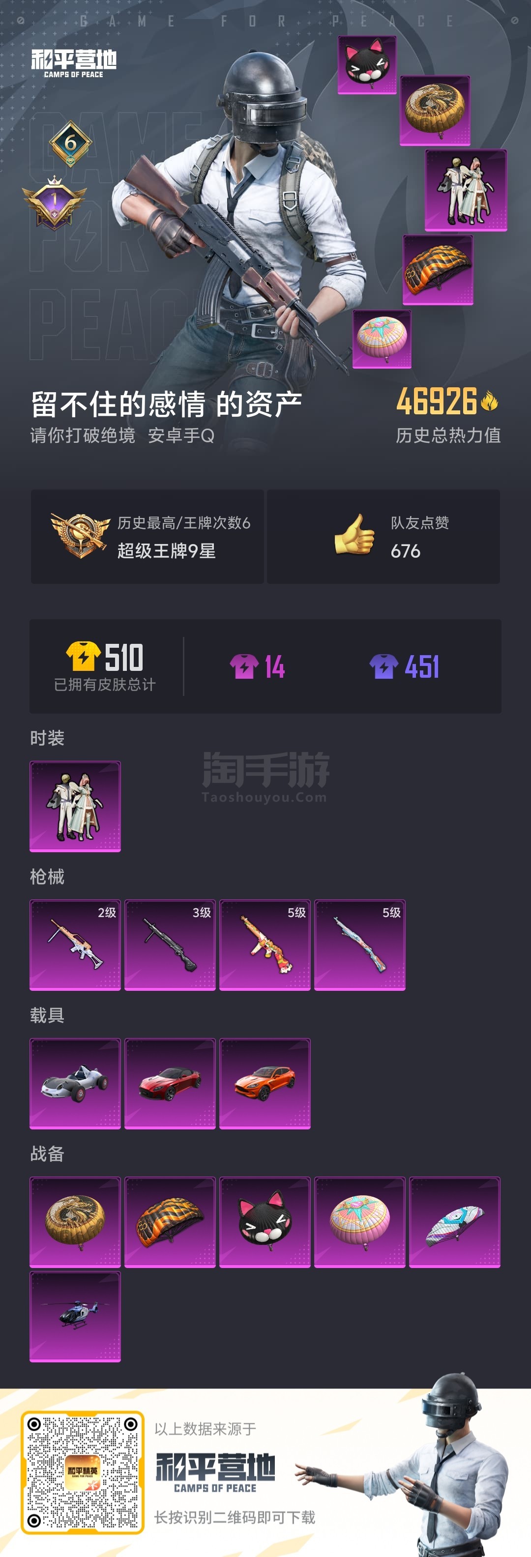时装数: 86 载具数: 4 枪械数: 153 战备数: 113 热门装扮: