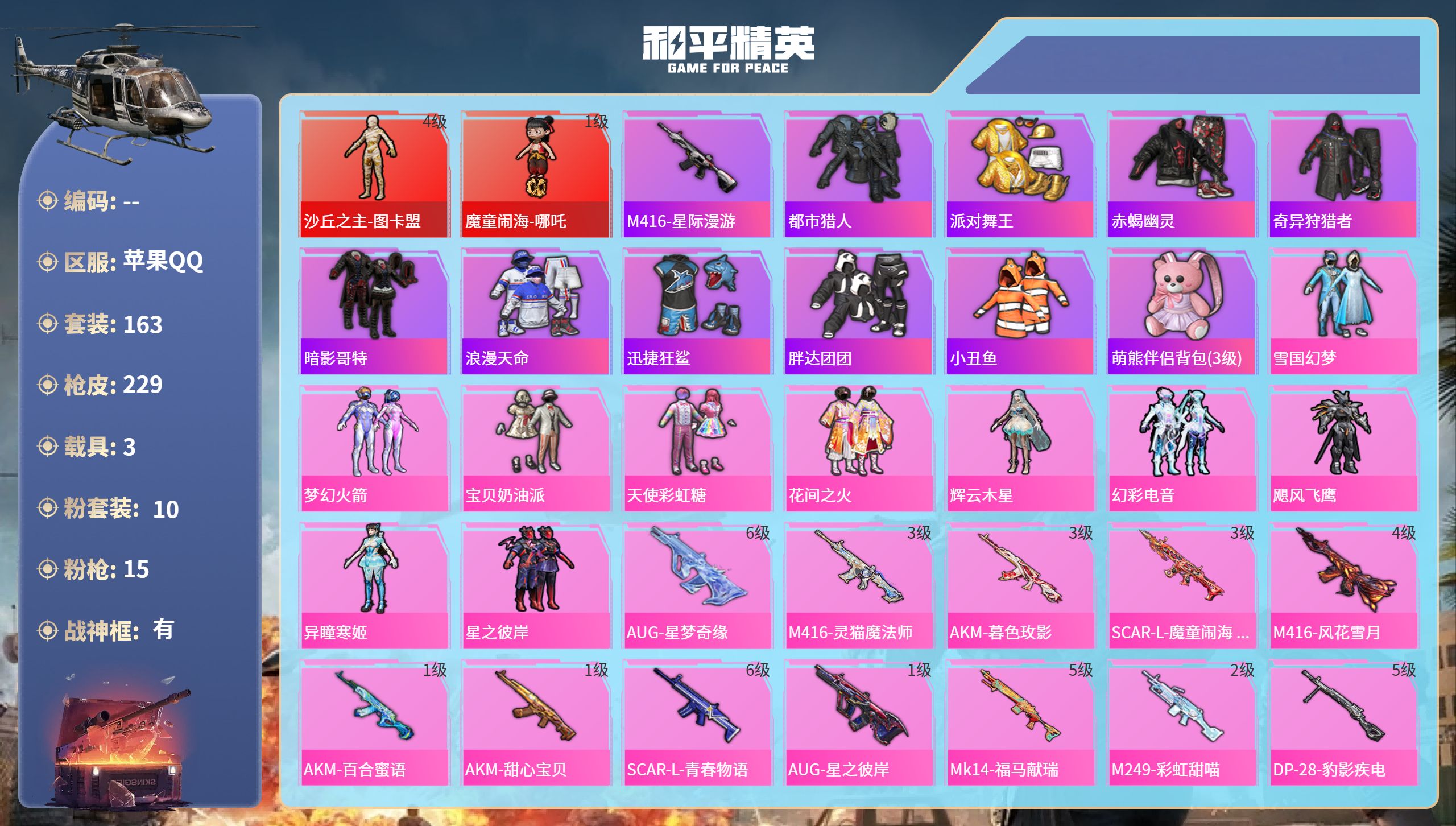 12王牌印记-有战神框-2红装-10粉装-15特效枪-3载具-90507热力值-163套装-229枪皮-1卓越印记