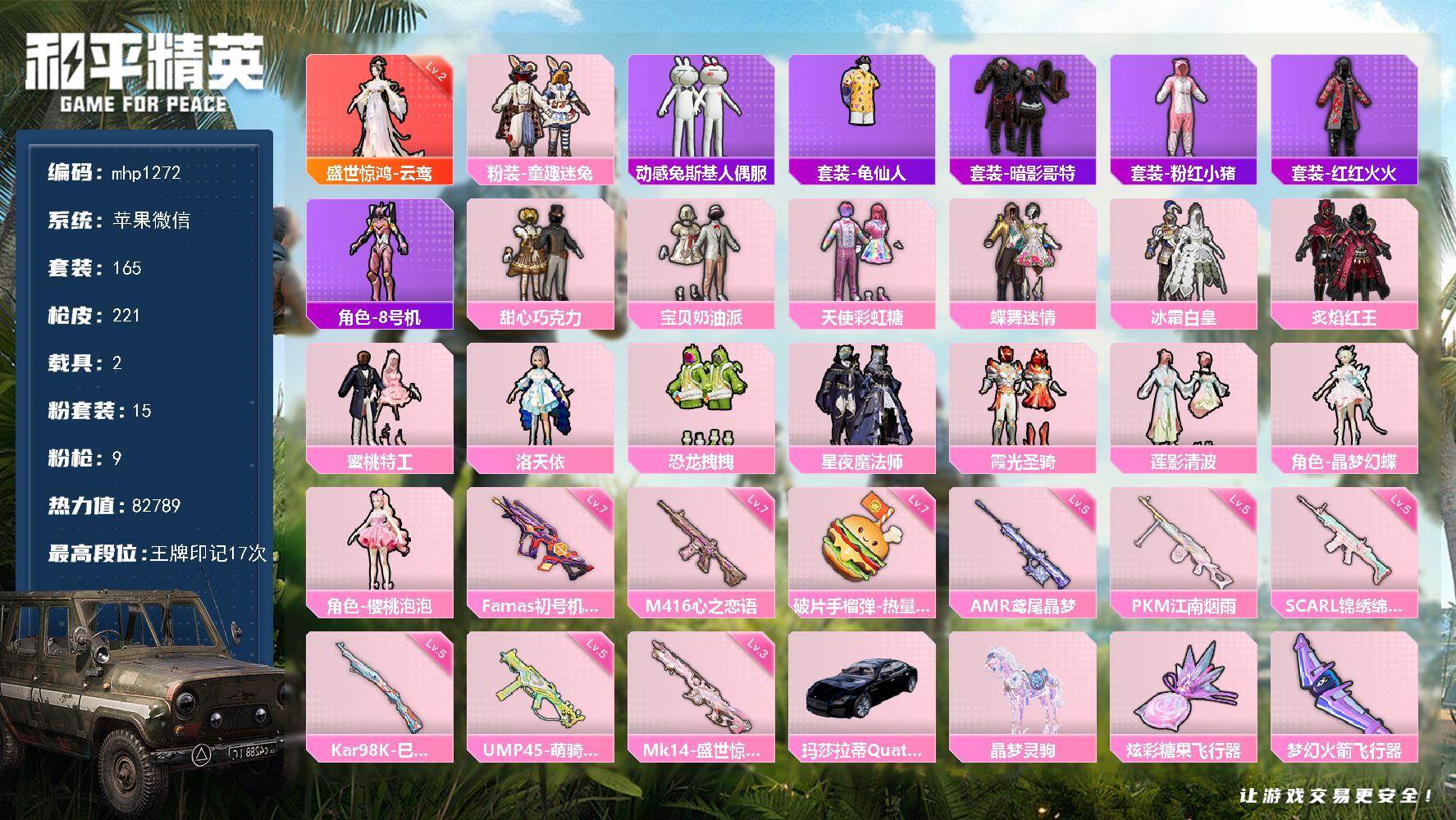 【mhp1272】苹果 微信-1神装-15粉装-9特效枪-2载具-7粉色飞行器