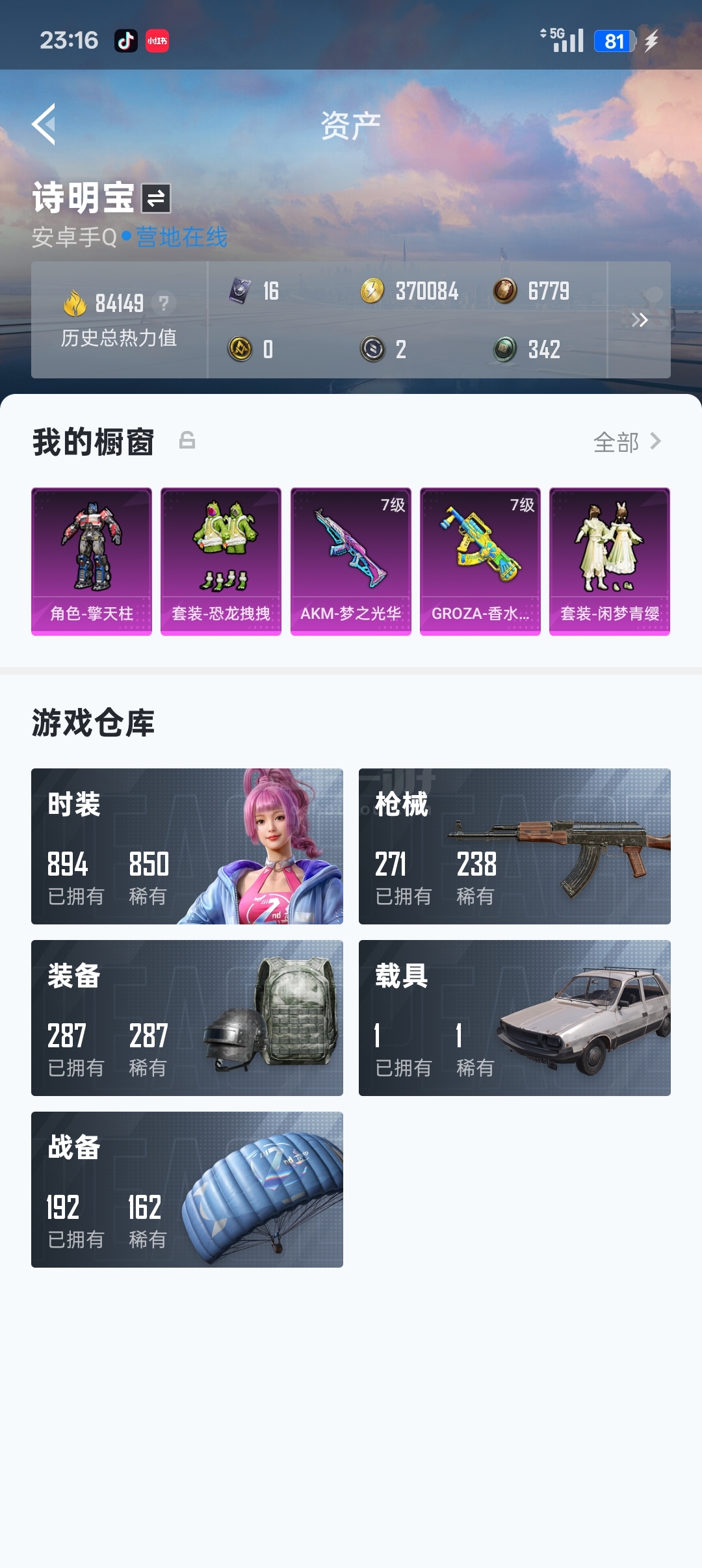 无敌战神,五红装,热力值22.7w,10个载具皮肤其中一个黄金宝马,号上还有两个车币