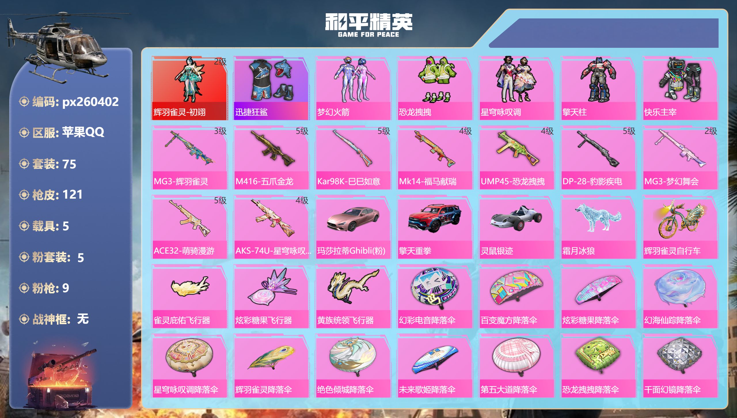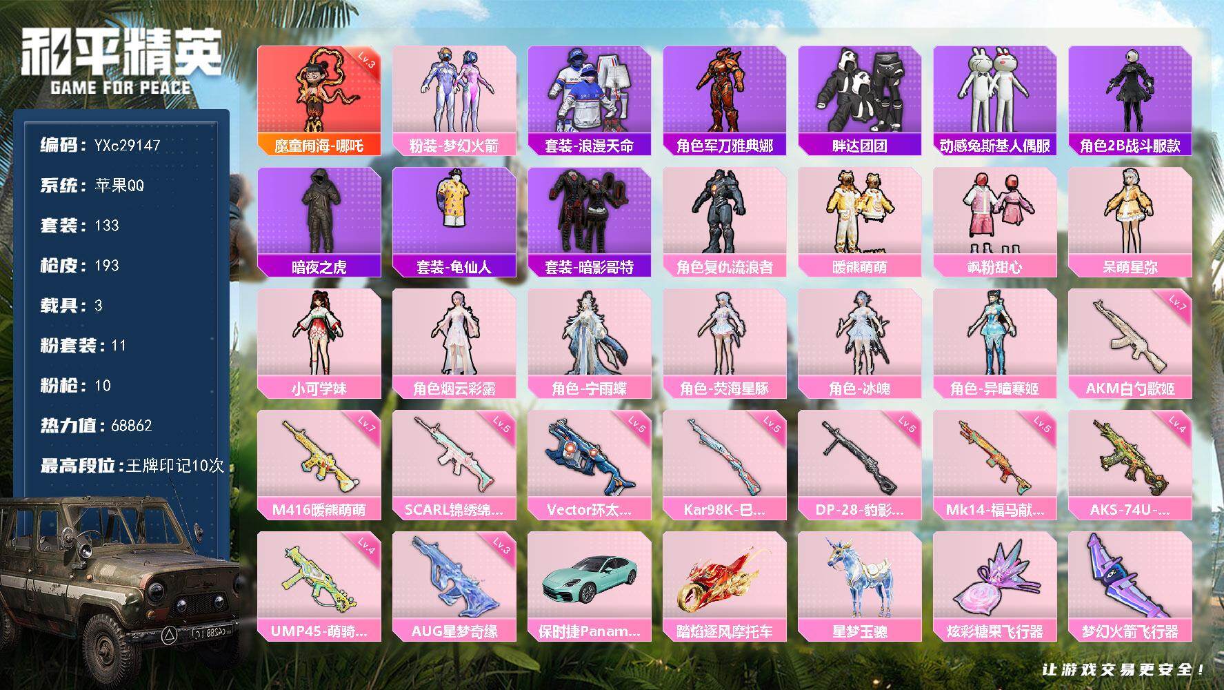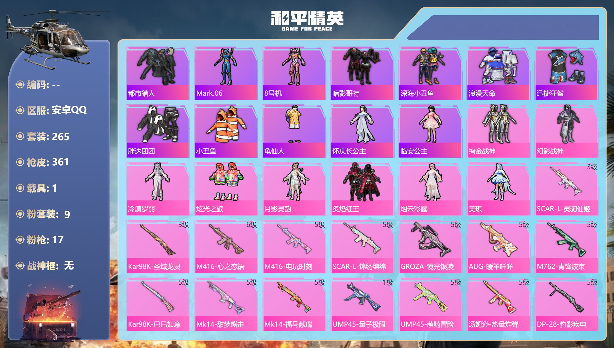 实名: 可修改 时装数: 591 载具数: 1 枪械数: 97 战备数: 77