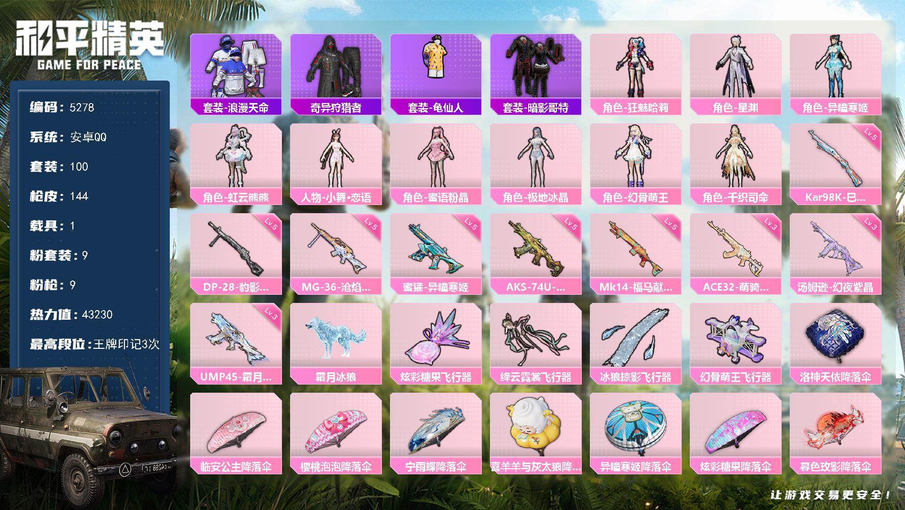 100套装/枪械9/装备190/载具1/战备88/王牌印记3/热力值43230/