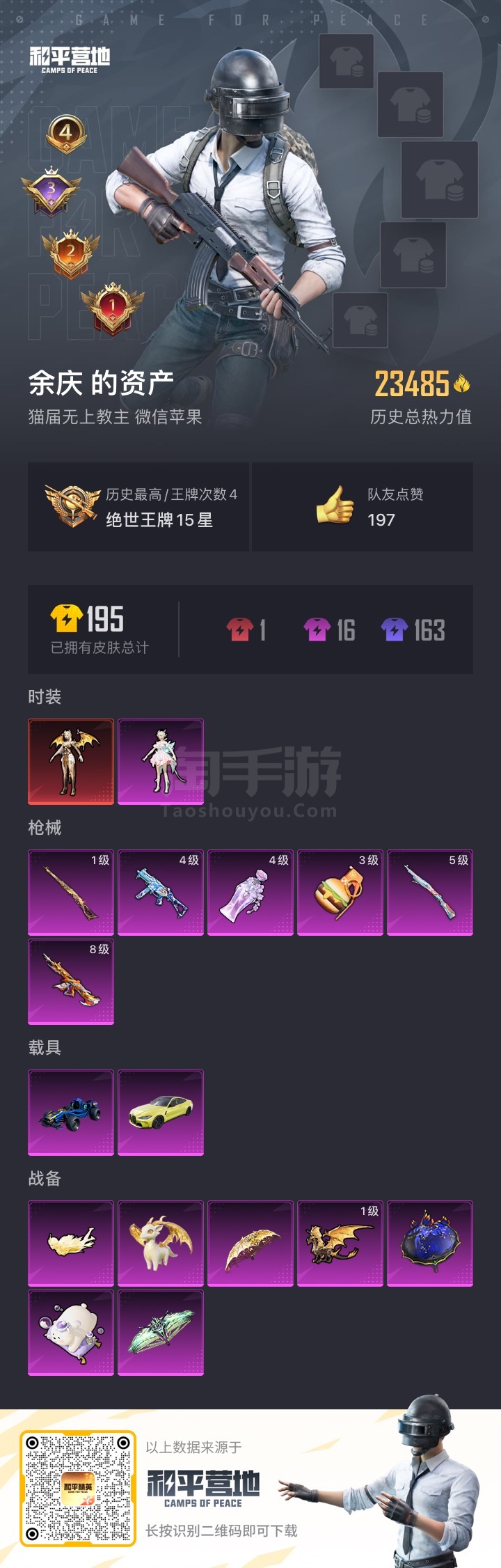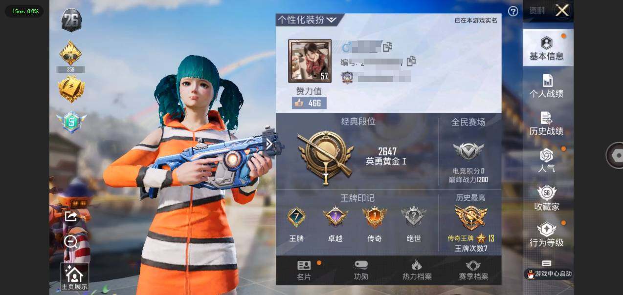 实名: 可修改 时装数: 463 载具数: 2 枪械数: 147 战备数: 1
