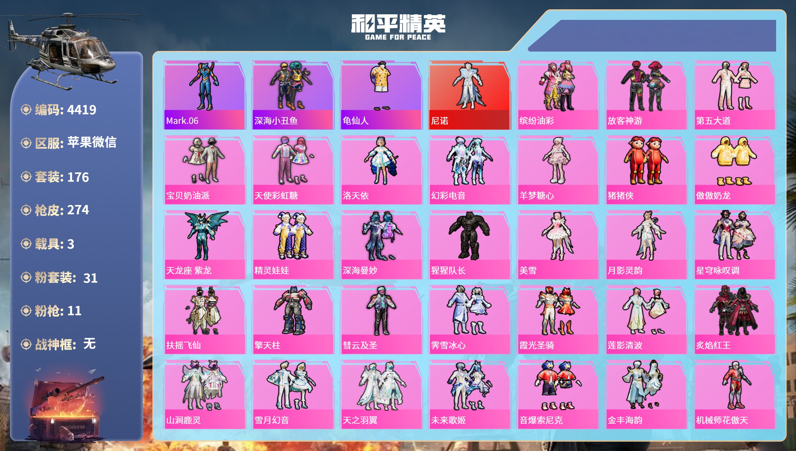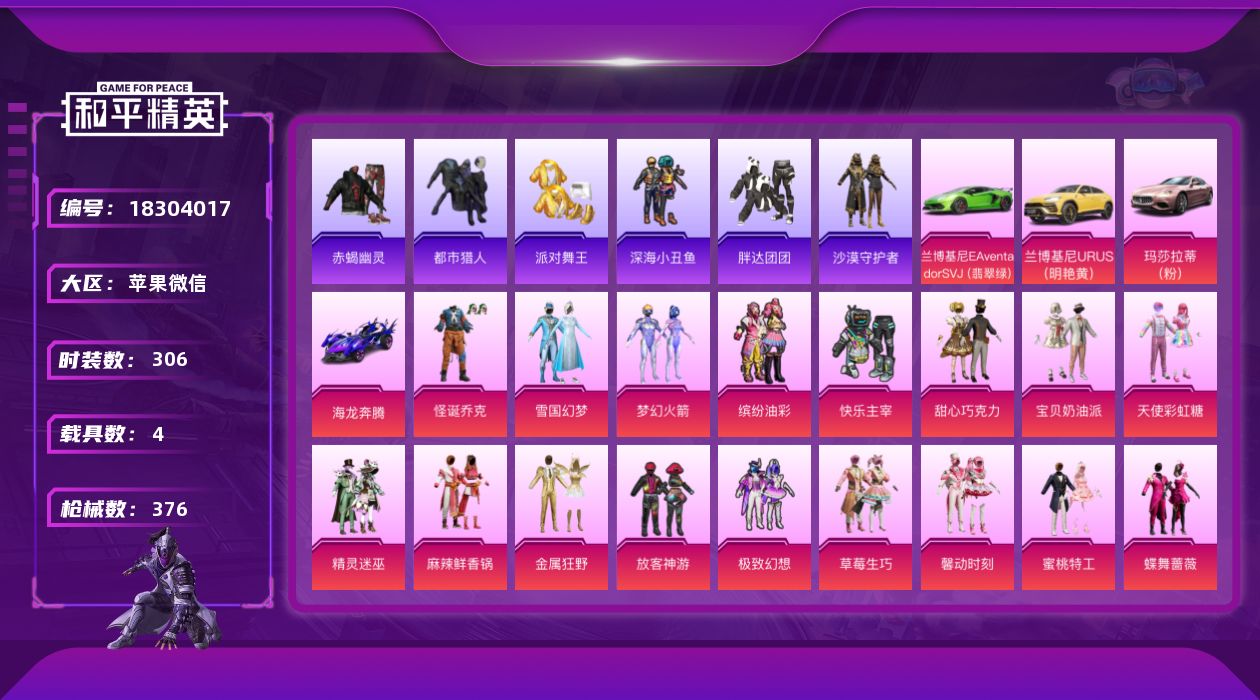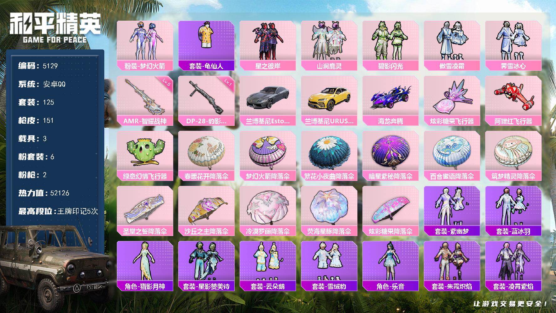 粉装6/粉枪2/载具3/珍稀飞行器130245,72277,72279/套装125/枪皮151/热力值52126/历史最高段位:王牌印记5次/