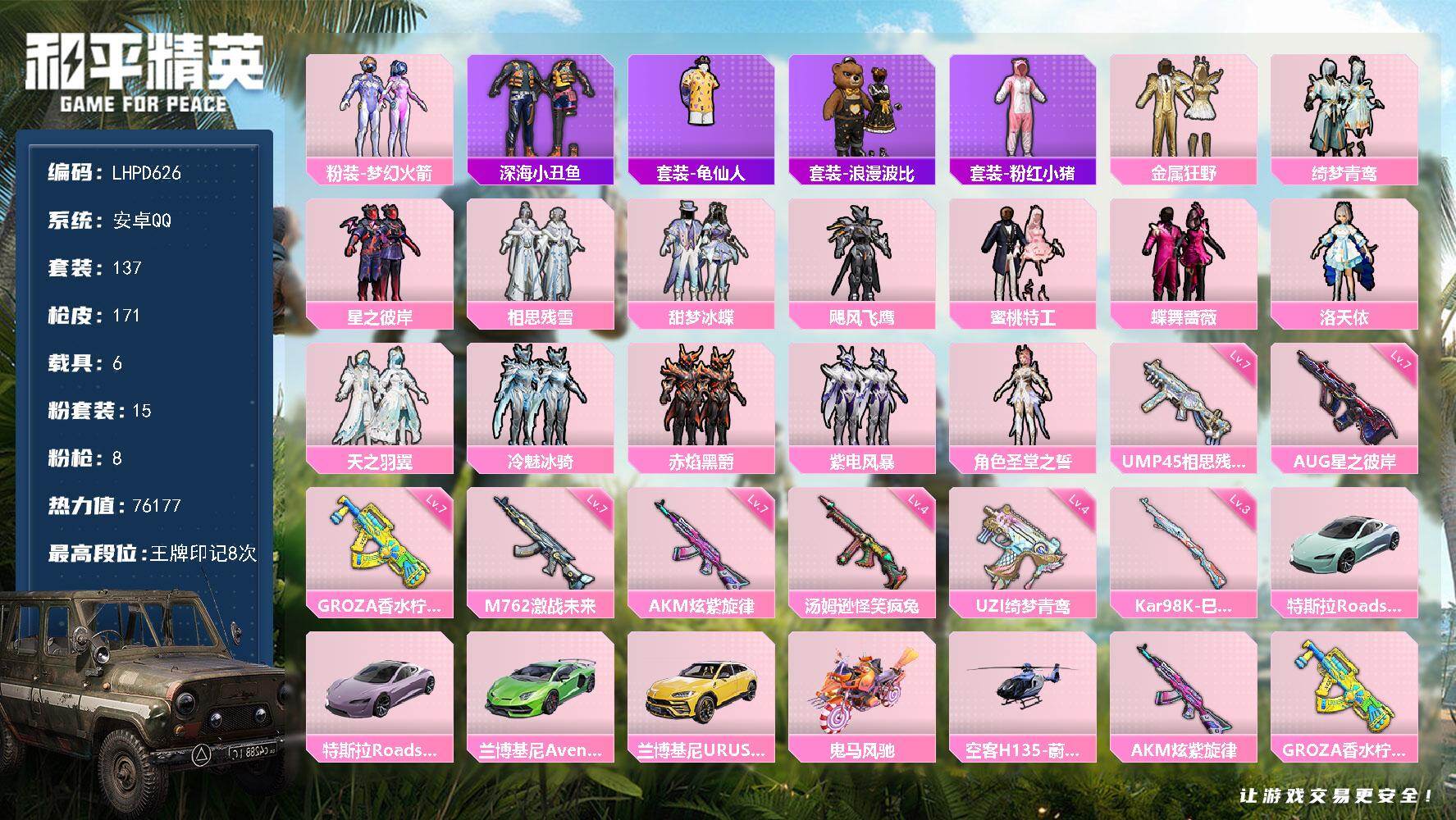 【店主推荐捡漏号!可直接换绑】安卓 手Q-15粉装-8特效枪-6载具-7粉色飞行