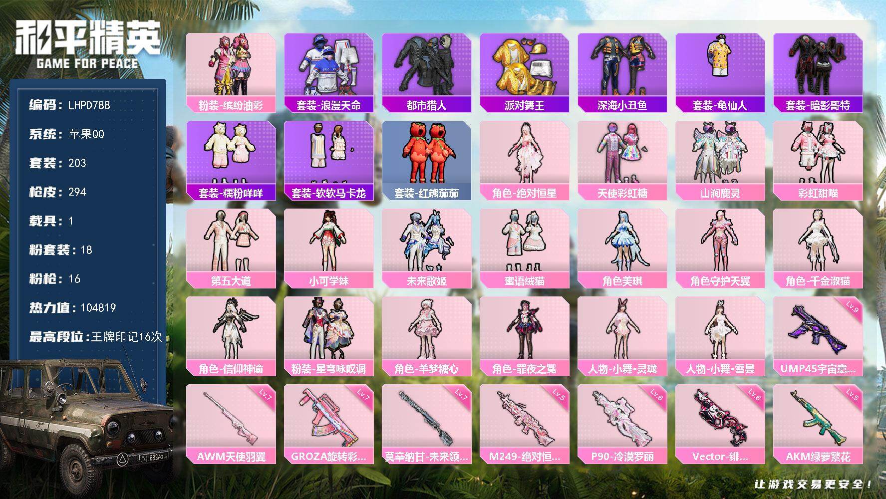 18粉装-16特效枪-1载具-10粉色飞行器-104819热力值-16王牌印记-203套装-294枪皮