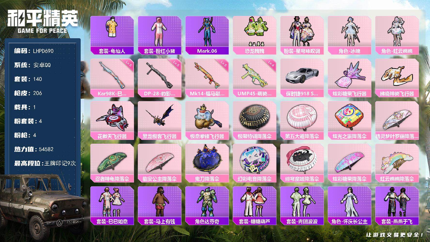 4粉装-4特效枪-1载具-5粉色飞行器-54582热力值-9王牌印记-140套装-206枪皮