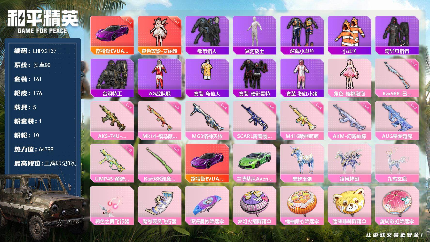 1神装-1粉装-10特效枪-5载具-2粉色飞行器-64799热力值-8王牌印记-161套装-176枪皮