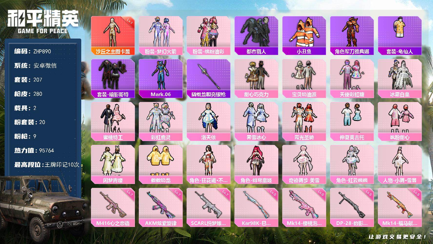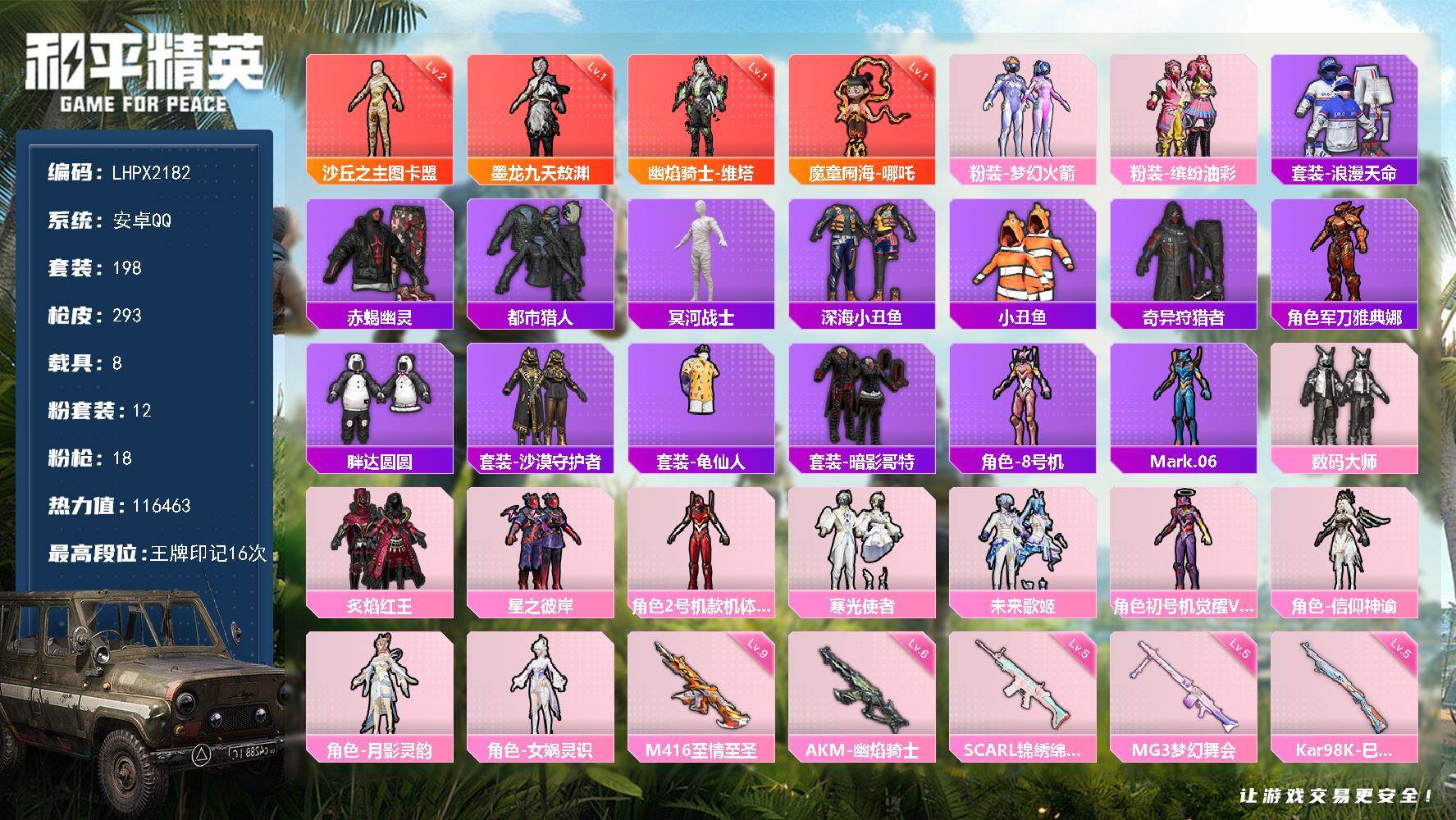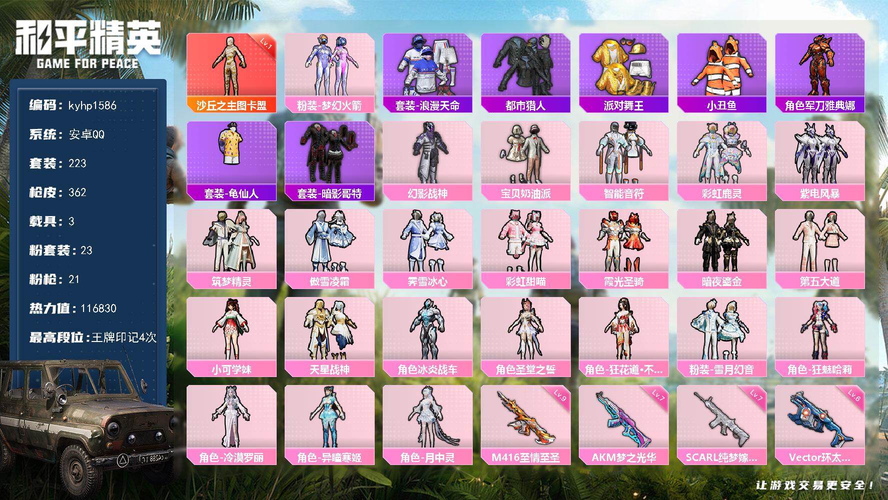 4神装-12粉装-18特效枪-8载具-14粉色飞行器-116463热力值-16王牌印记-198套装-293枪皮