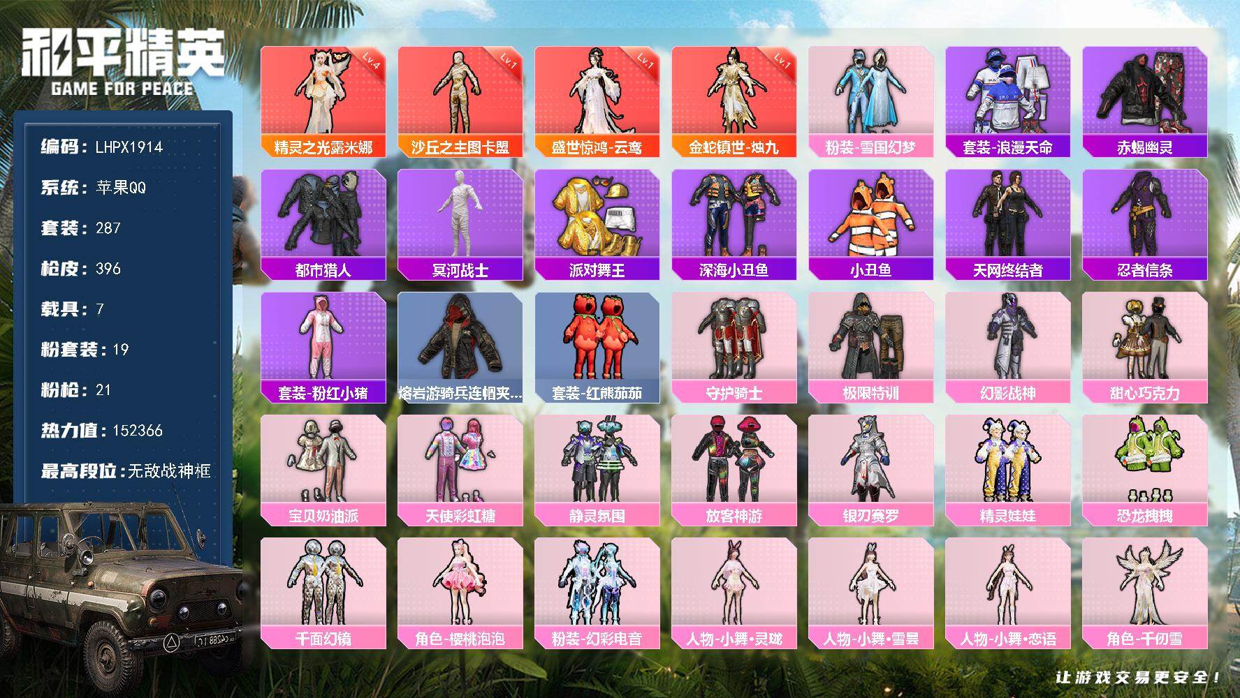 无敌战神框-4神装-19粉装-21特效枪-7载具-22粉色飞行器-152366热力值-17王牌印记-287套装-396枪皮