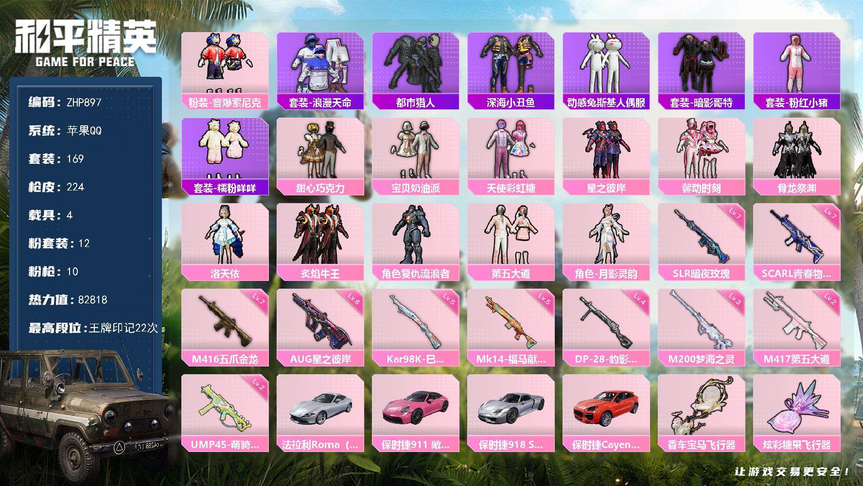 12粉装-10特效枪-4载具-8粉色飞行器-82818热力值-22王牌印记-169套装-224枪皮