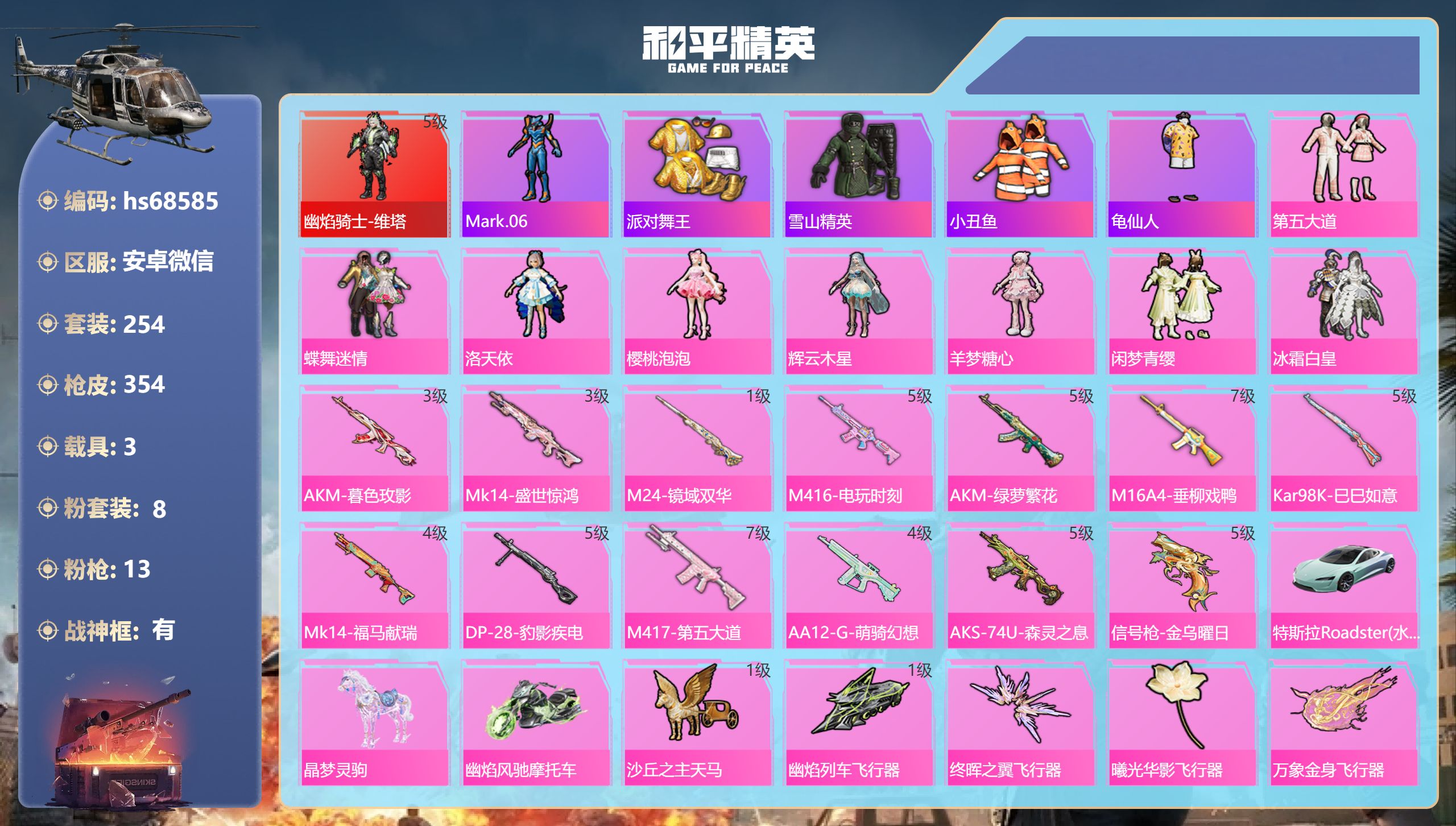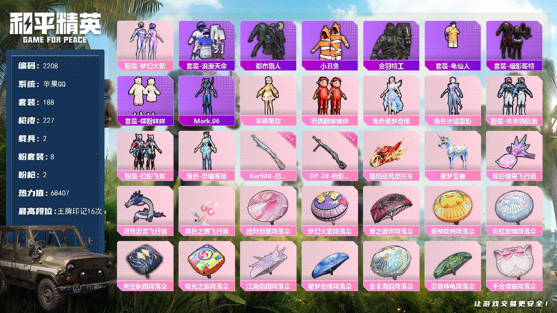 8粉装-2特效枪-2载具-3粉色飞行器-68407热力值-16王牌印记-188套装-227枪皮
