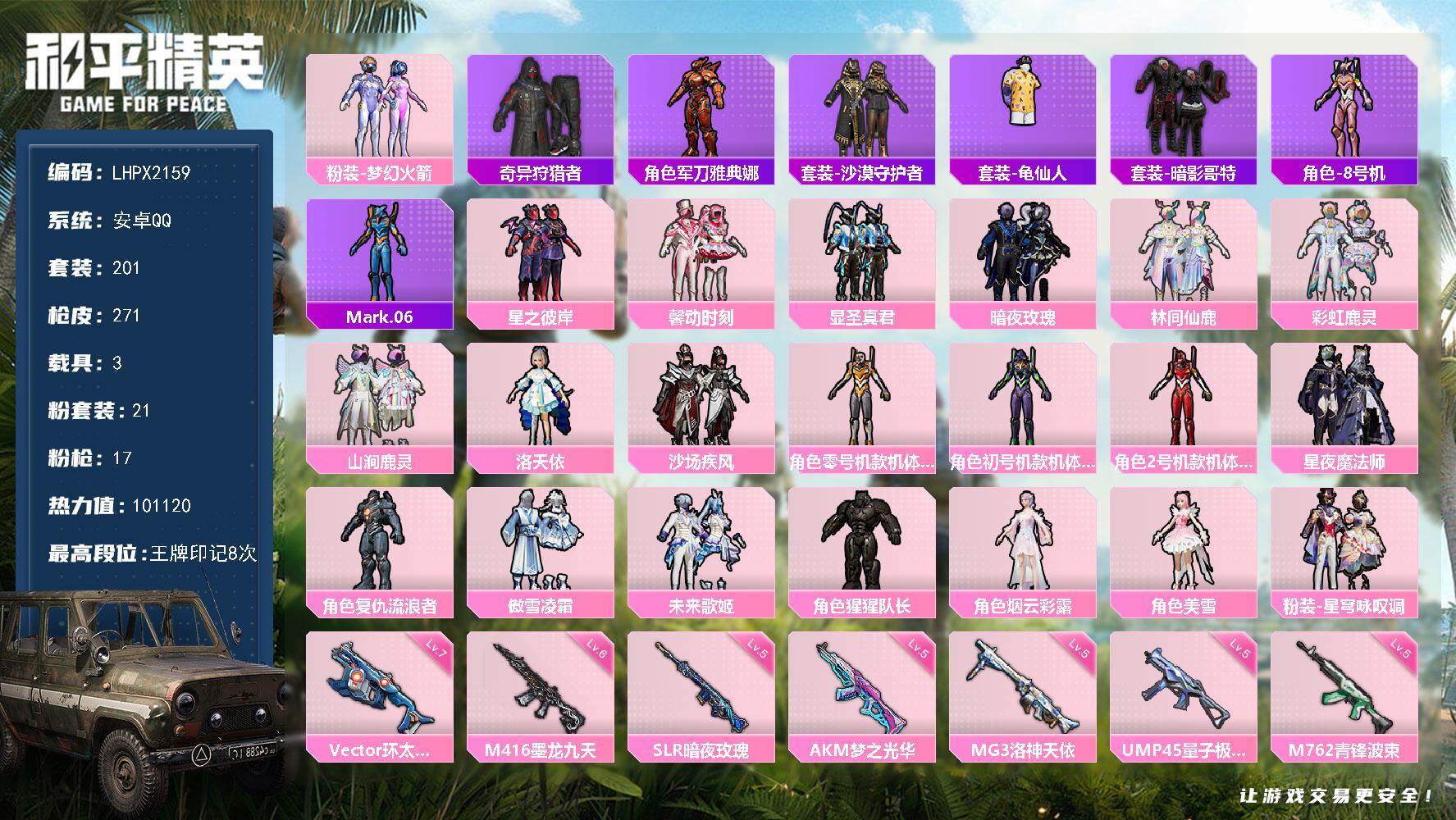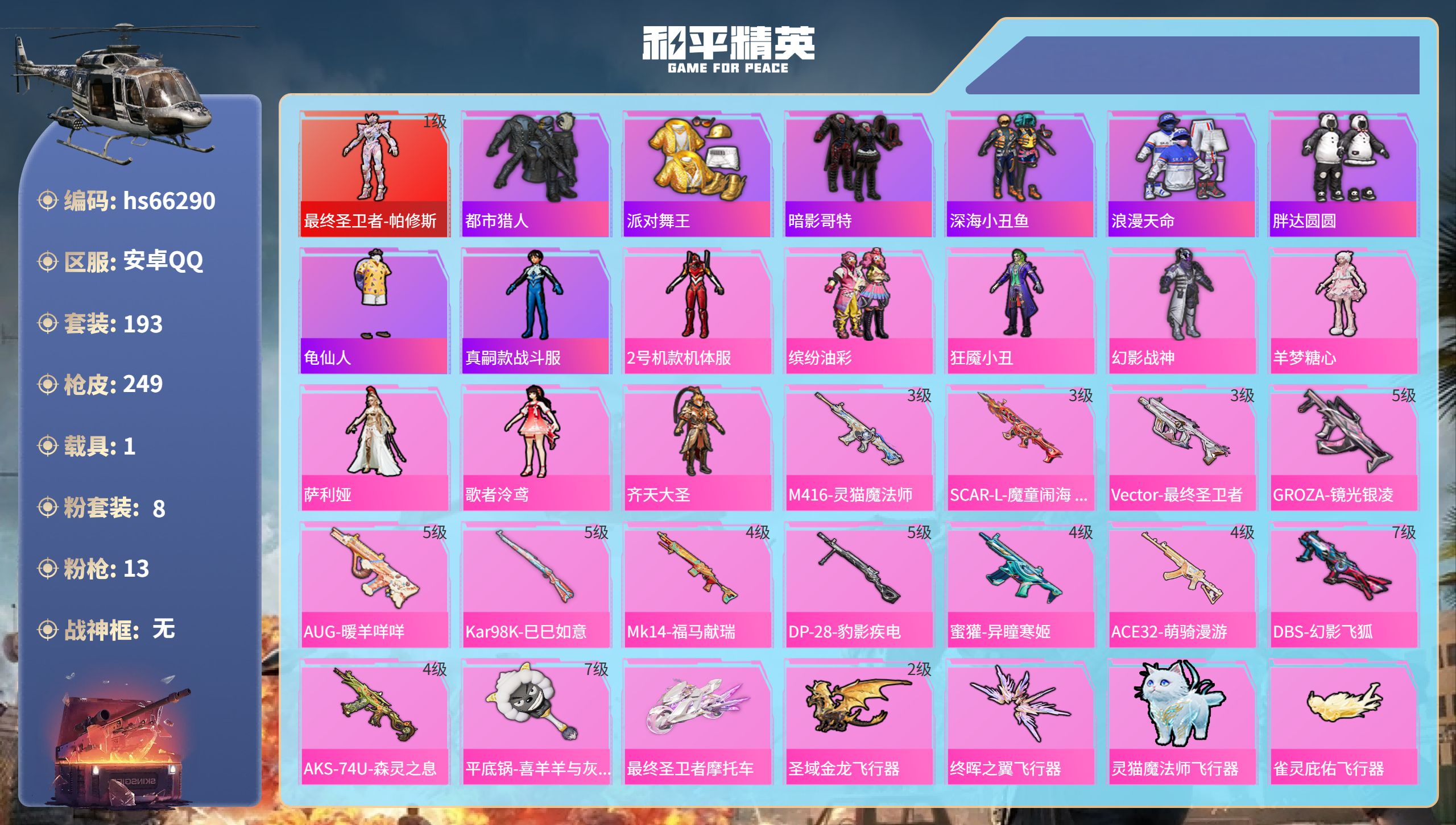 安卓手Q-14王牌印记-1红装-8粉装-13特效枪-1载具-79764热力值-1