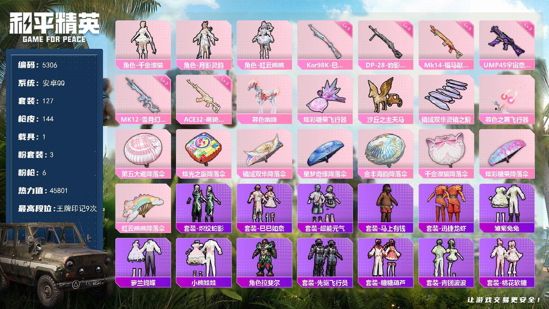 安卓 手Q-5粉装-6特效枪-6载具-3粉色飞行器-73826热力值-5王牌印记