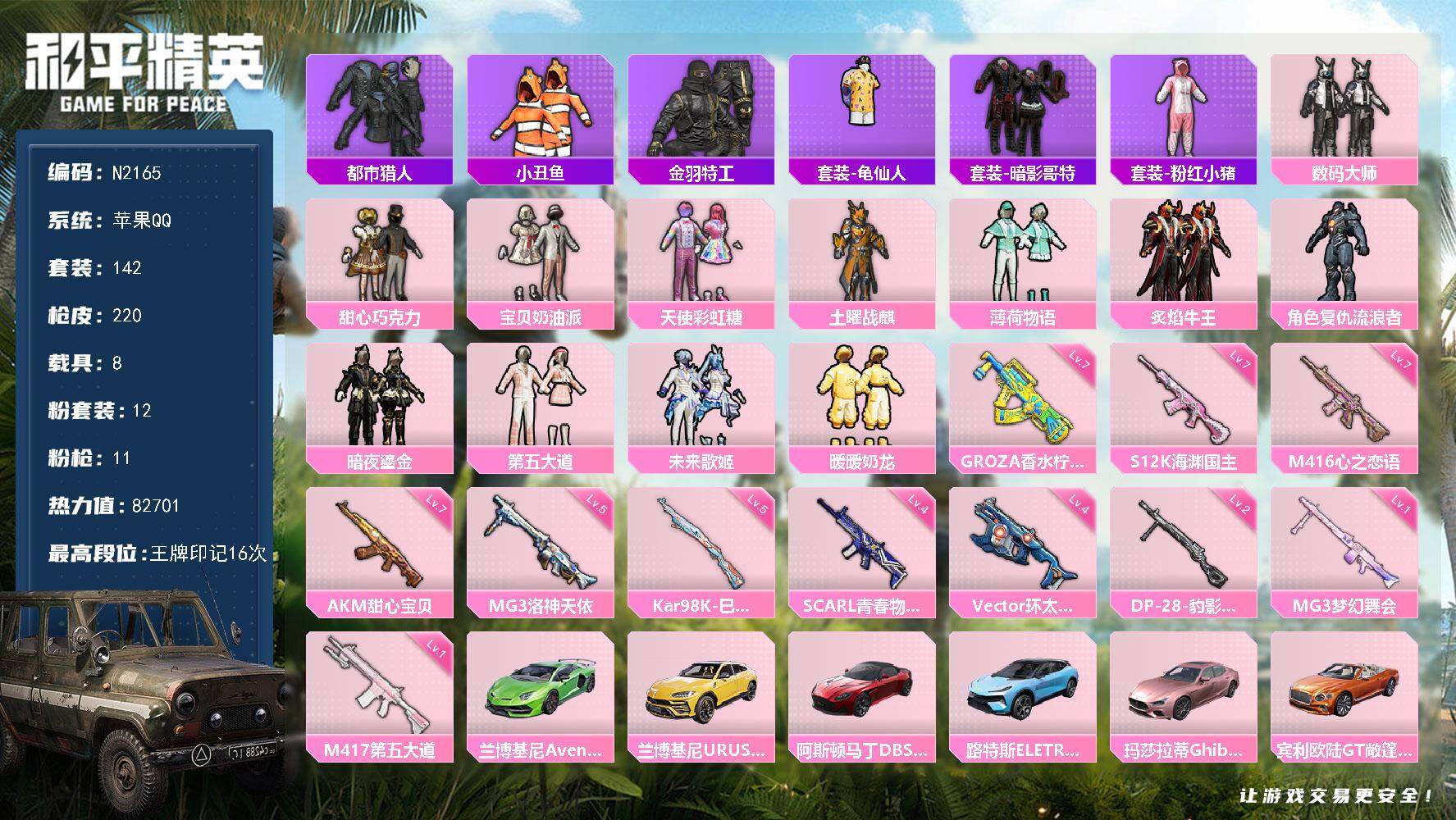 苹果 手Q-12粉装-11特效枪-8载具-1粉色飞行器-82701热力值-16王