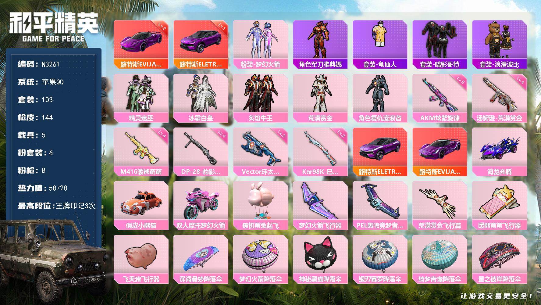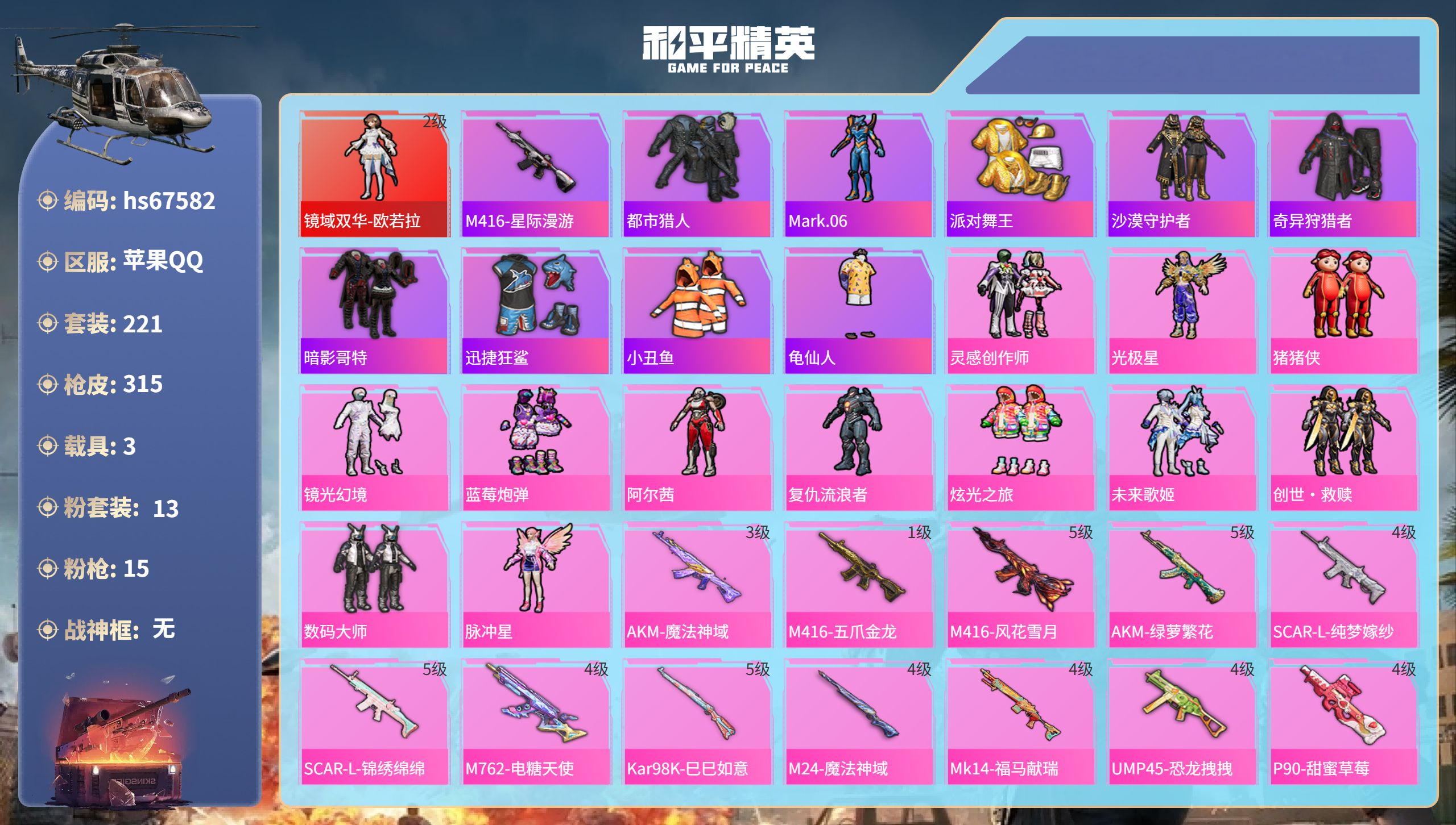 6粉装-6特效枪-6载具-1粉色飞行器-76398热力值-14王牌印记-167套装-207枪皮