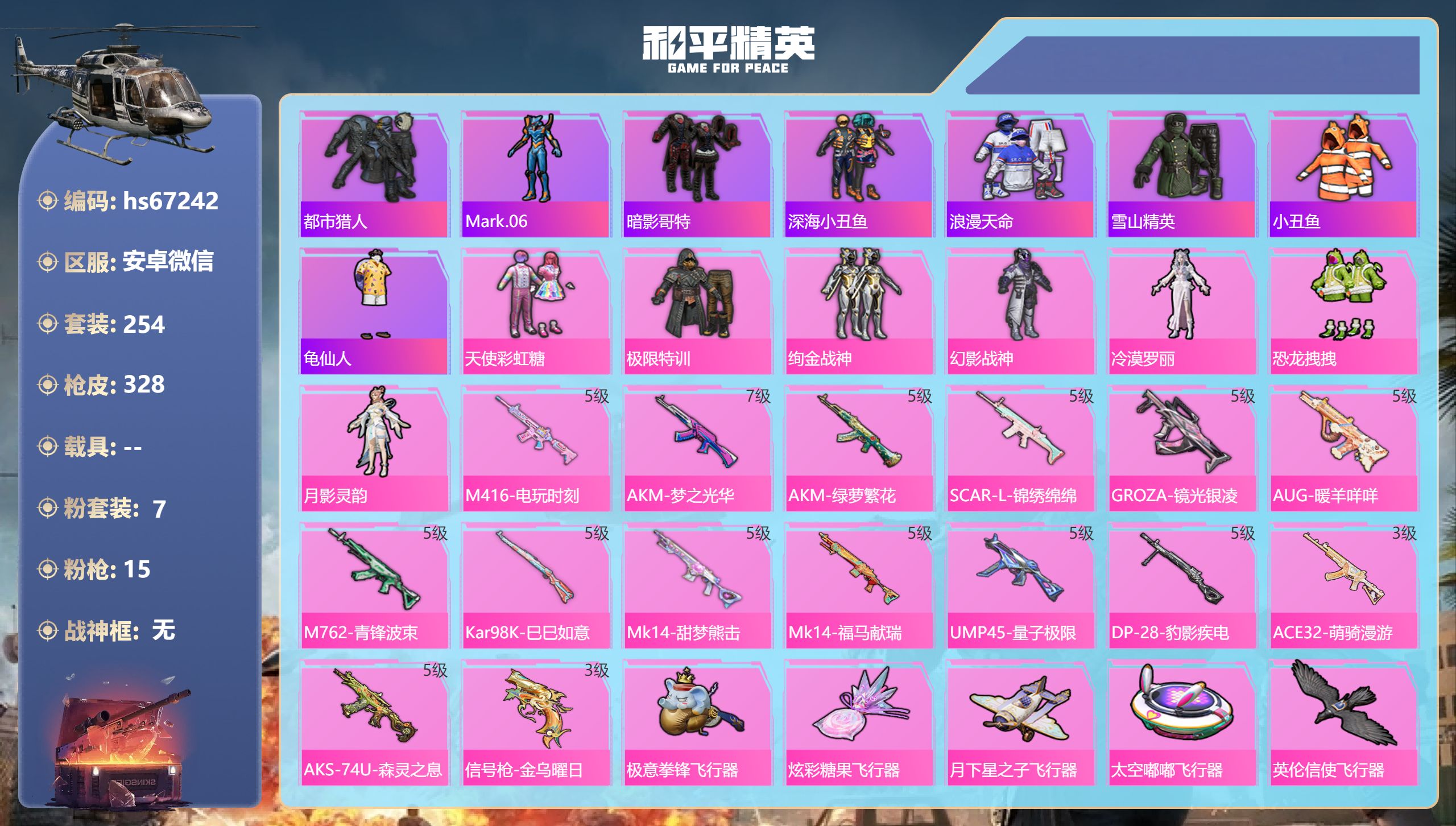15王牌印记-7粉装-15特效枪-热力值-254套装-