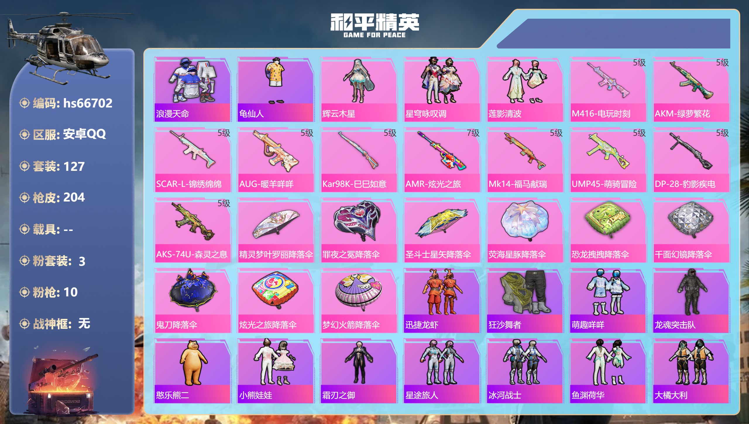 1载具-4粉装-11特效枪-117套装-175枪皮-9王牌印记-超级王牌6星-55326热力值
