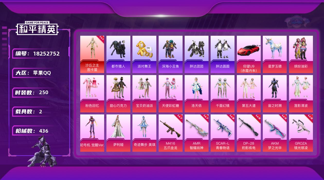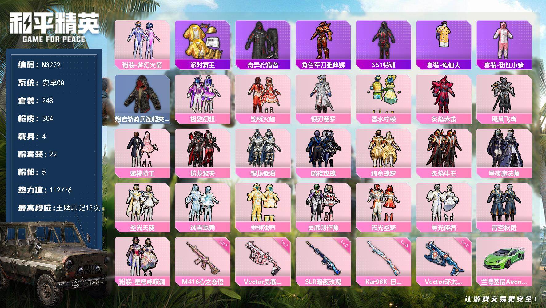 22粉装-5特效枪-4载具-8粉色飞行器-112776热力值-12王牌印记-248套装-304枪皮