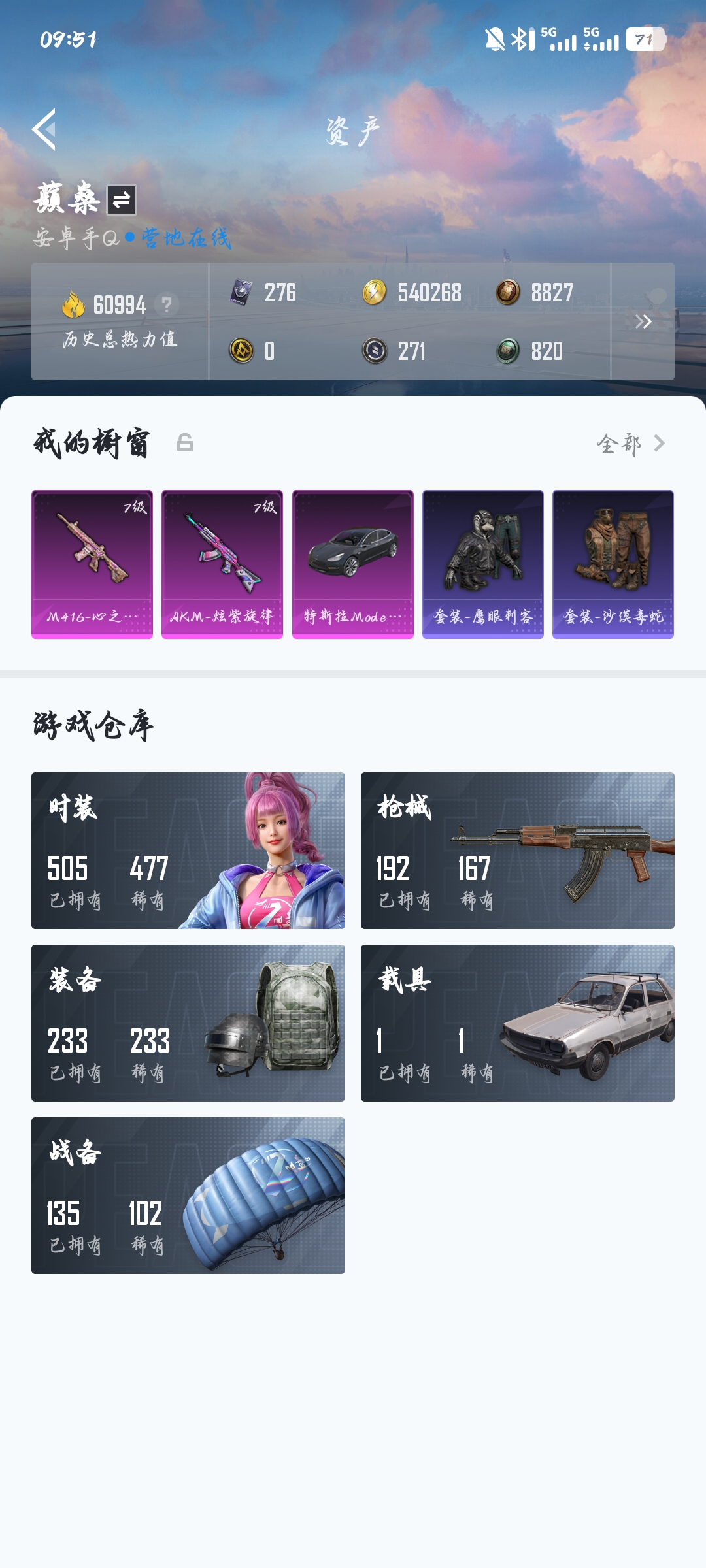 2载具 1升级枪 5粉装 1飞行器 57枪皮 47套装 23514热力 3印记 铂金