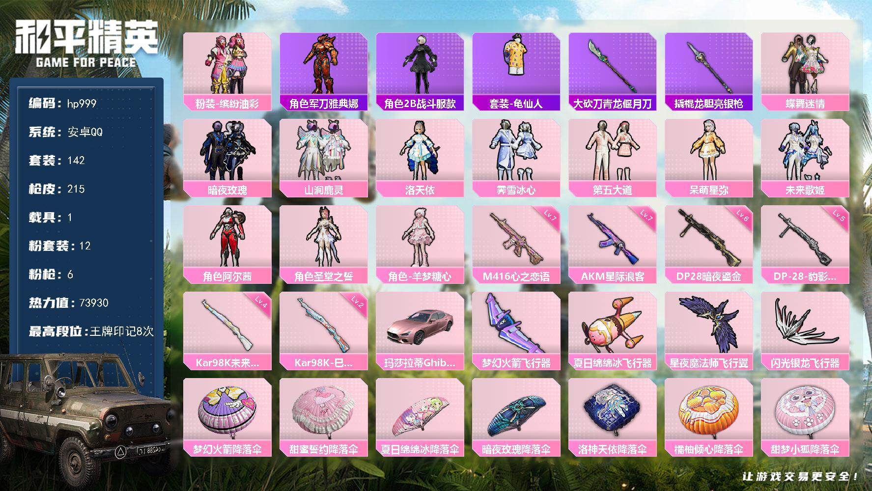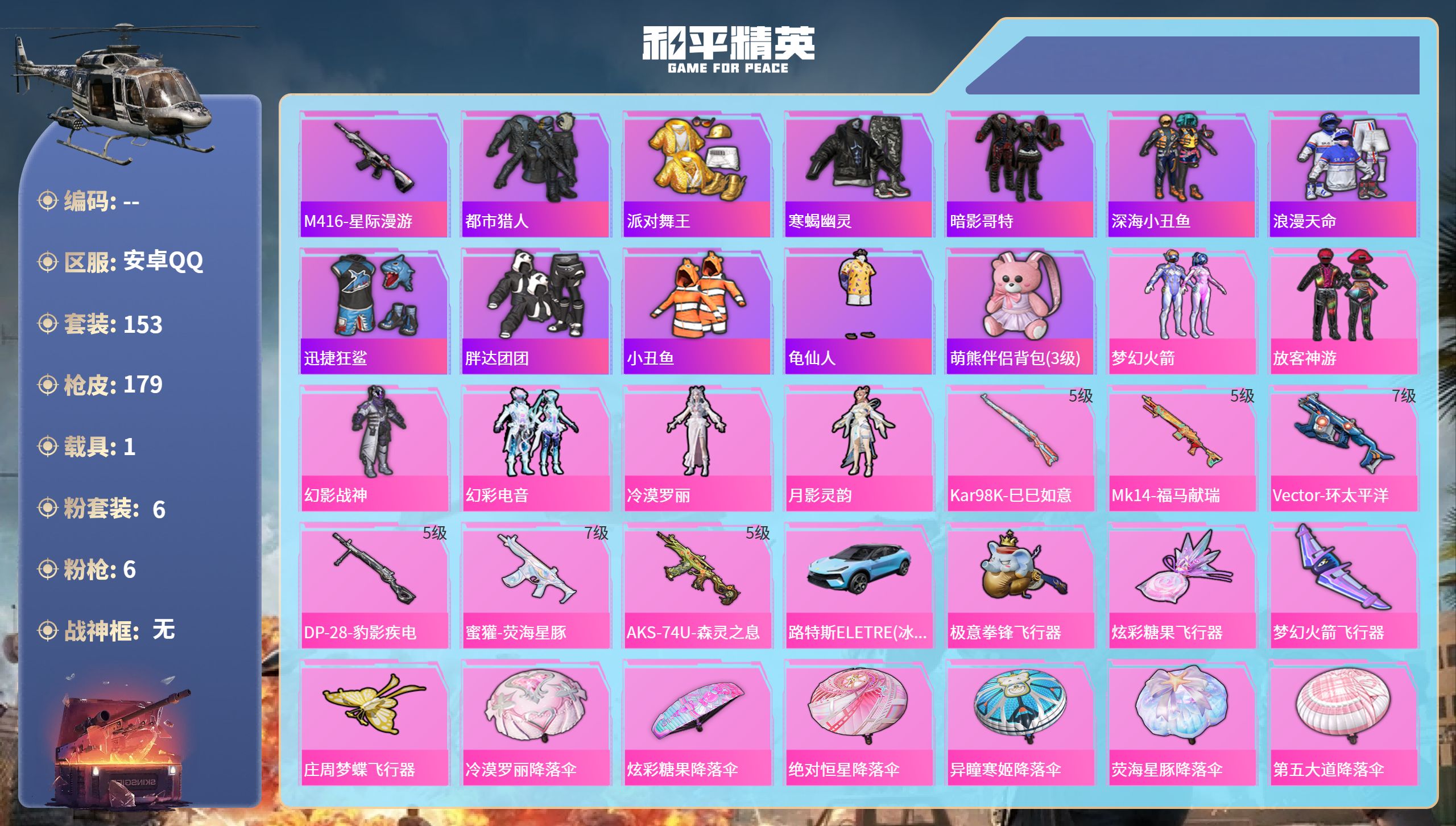 安卓 手Q-0粉装-4特效枪-0载具-1粉色飞行器-7423热力值-0王牌印记