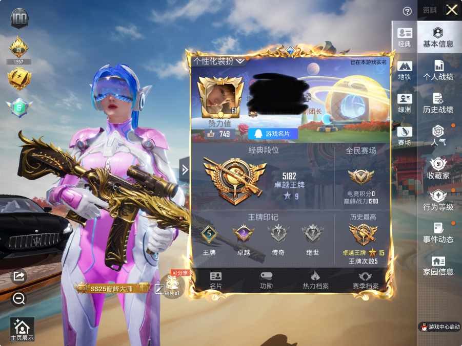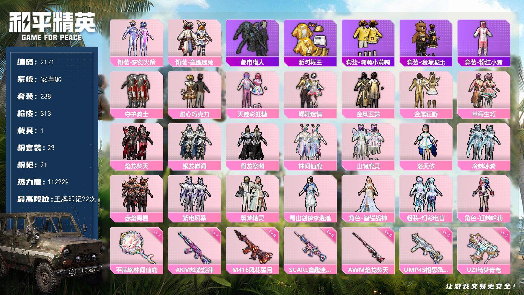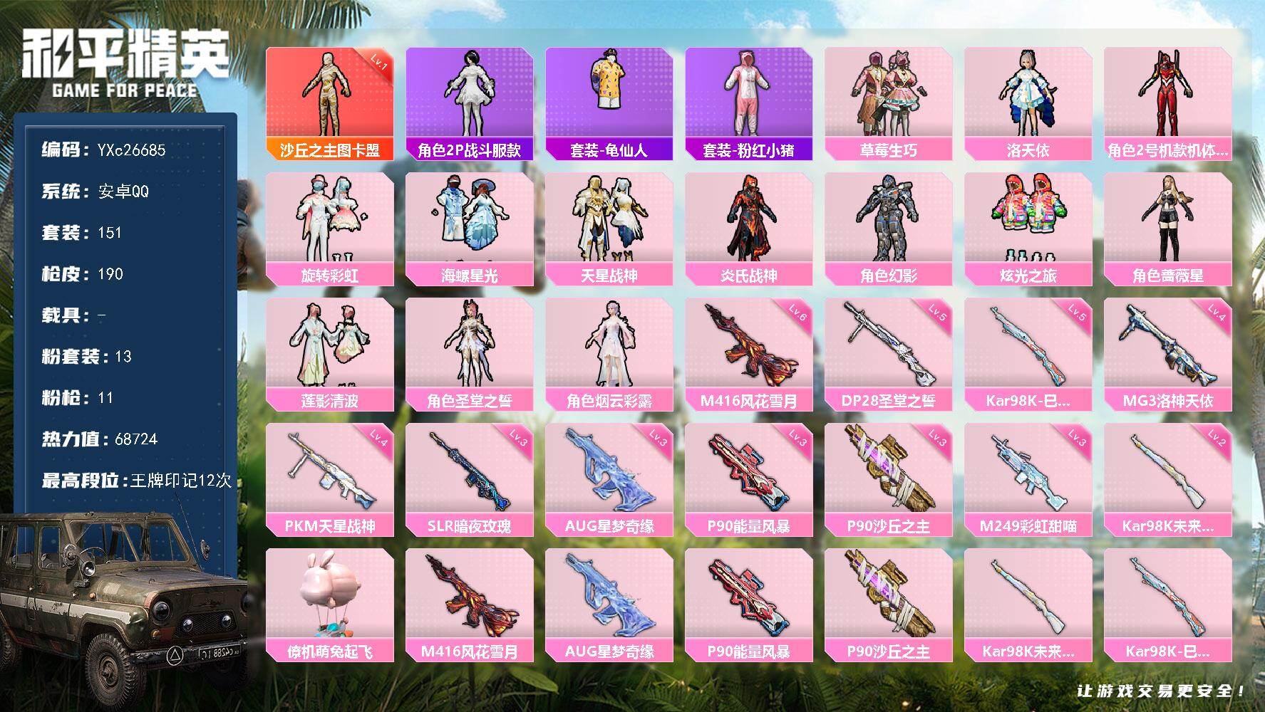 9王牌印记-6粉装-6特效枪-1载具-59094热力值-153套装-179枪皮-1卓越印记-1传奇印记
