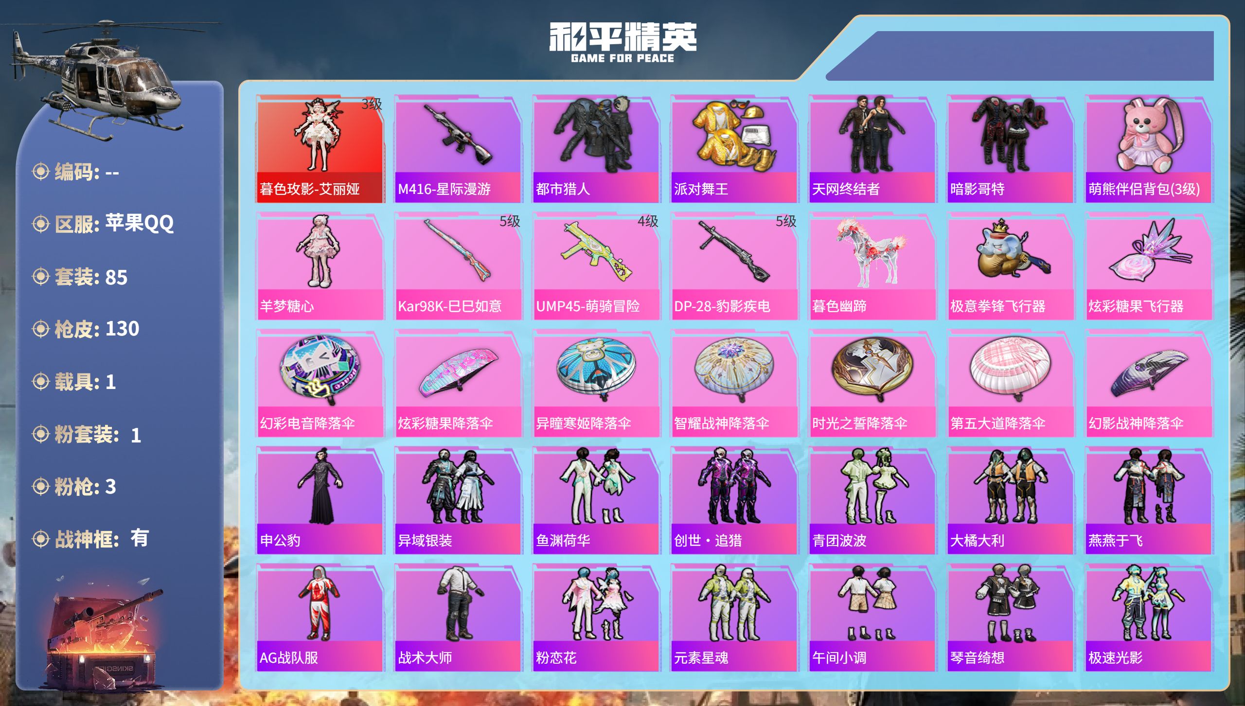 12粉装-6特效枪-1载具-5粉色飞行器-73930热力值-8王牌印记-142套装-215枪皮