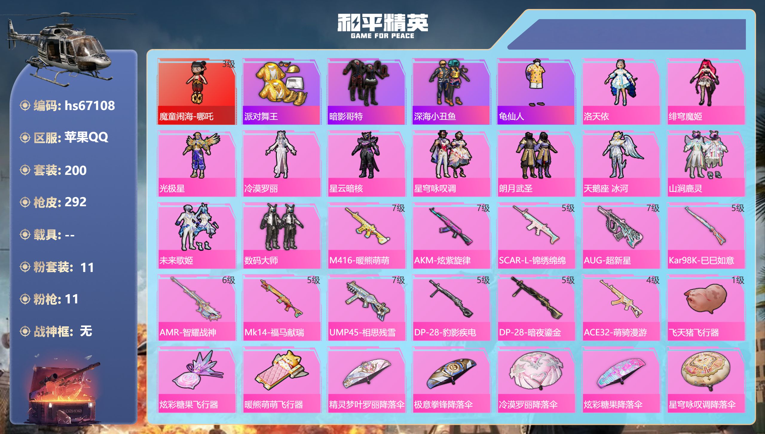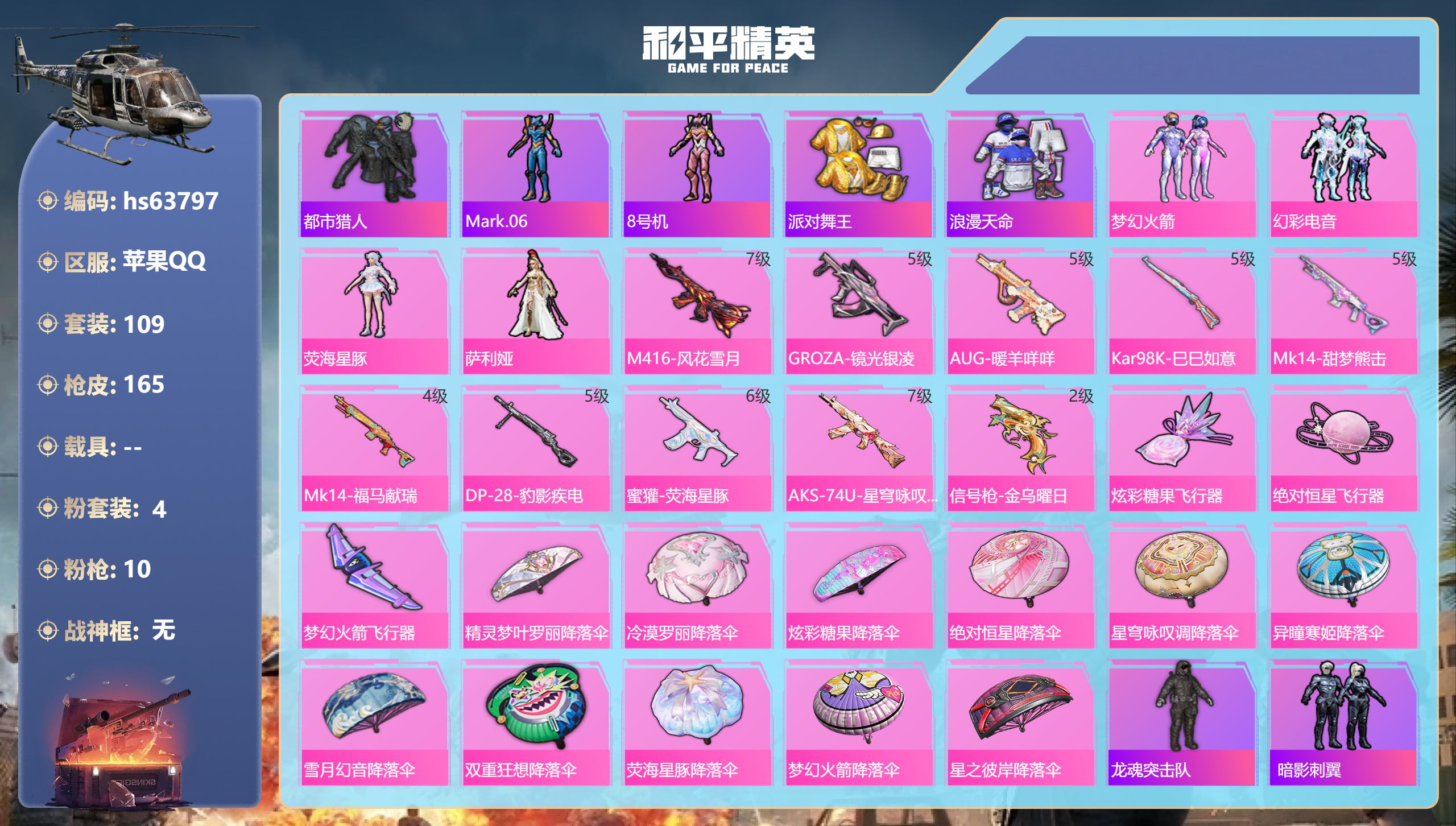 4粉装-11特效枪-1载具-3粉色飞行器-65588热力值-13王牌印记-162套装-240枪皮