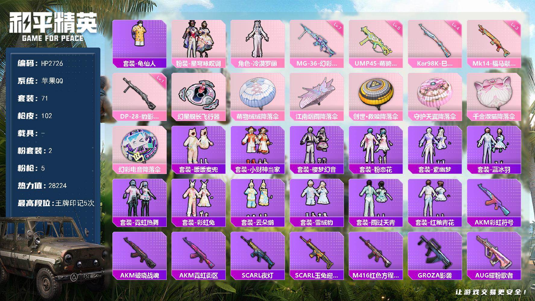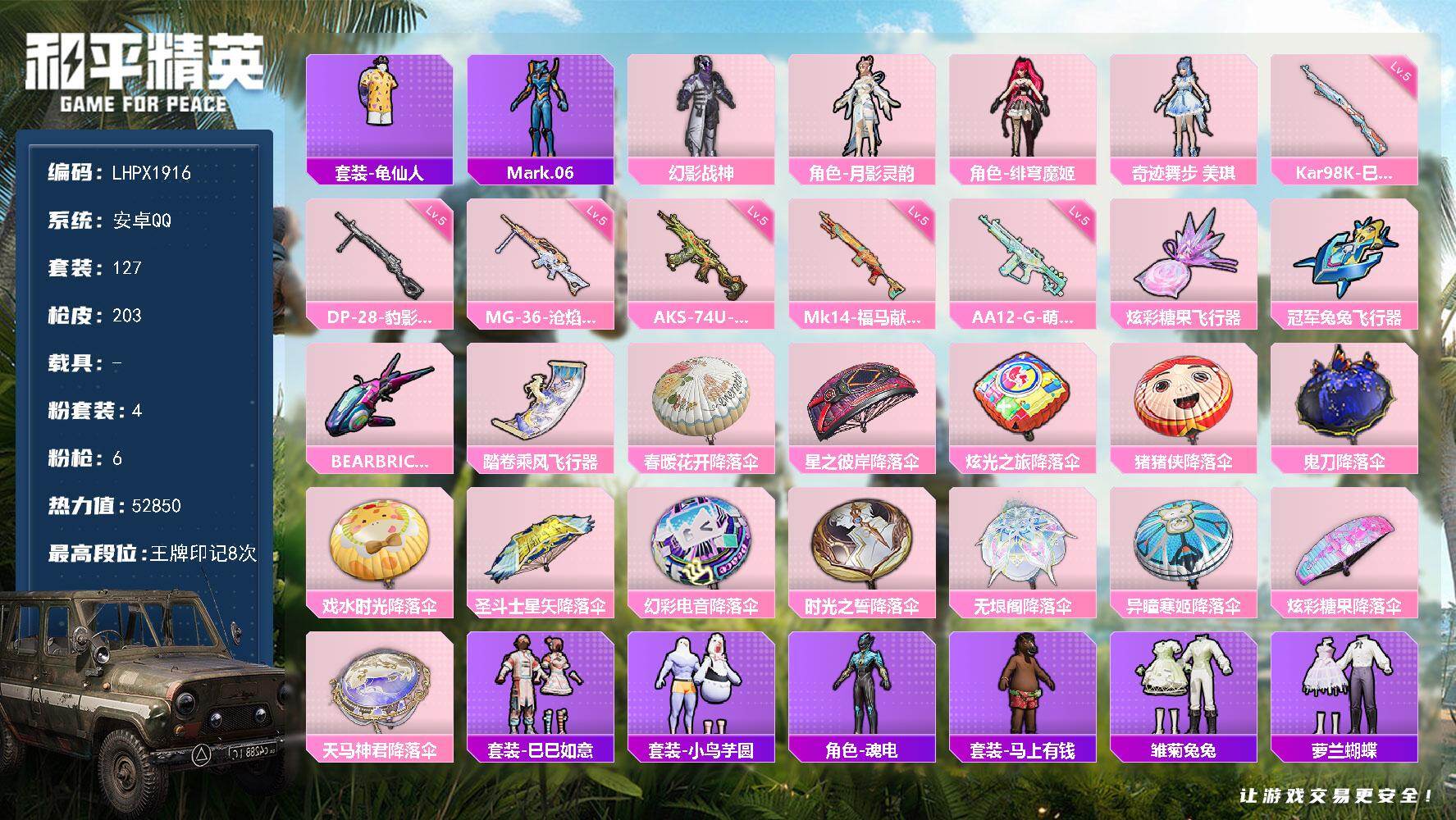 4粉装-5特效枪-2载具-5粉色飞行器-26332热力值-2王牌印记-50套装-82枪皮
