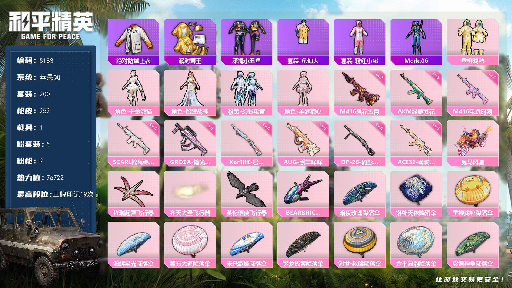 5粉装-9特效枪-1载具-4粉色飞行器-76722热力值-19王牌印记-200套装-252枪皮