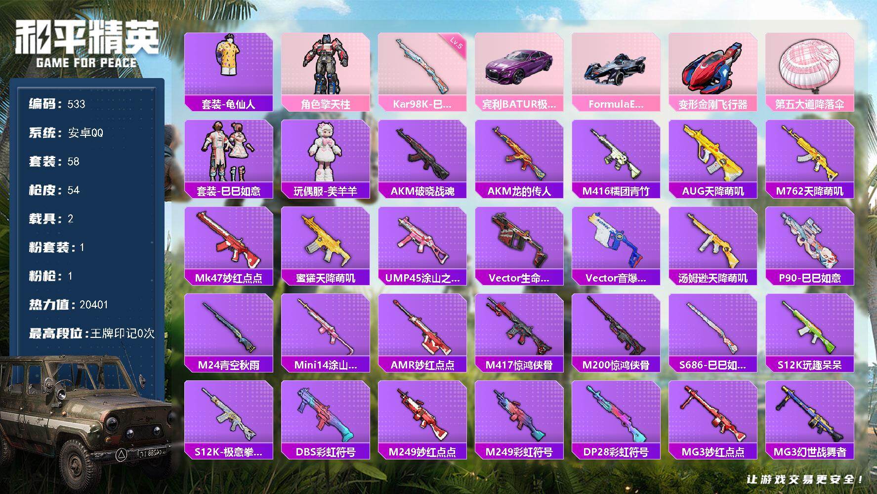 安卓 手Q-1粉装-9特效枪-0载具-1粉色飞行器-54355热力值-9王牌印记