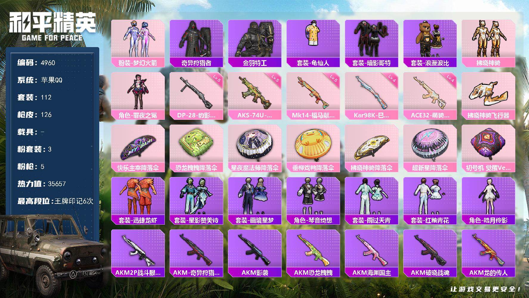 苹果 手Q-3粉装-5特效枪-0载具-1粉色飞行器-35657热力值-6王牌印记