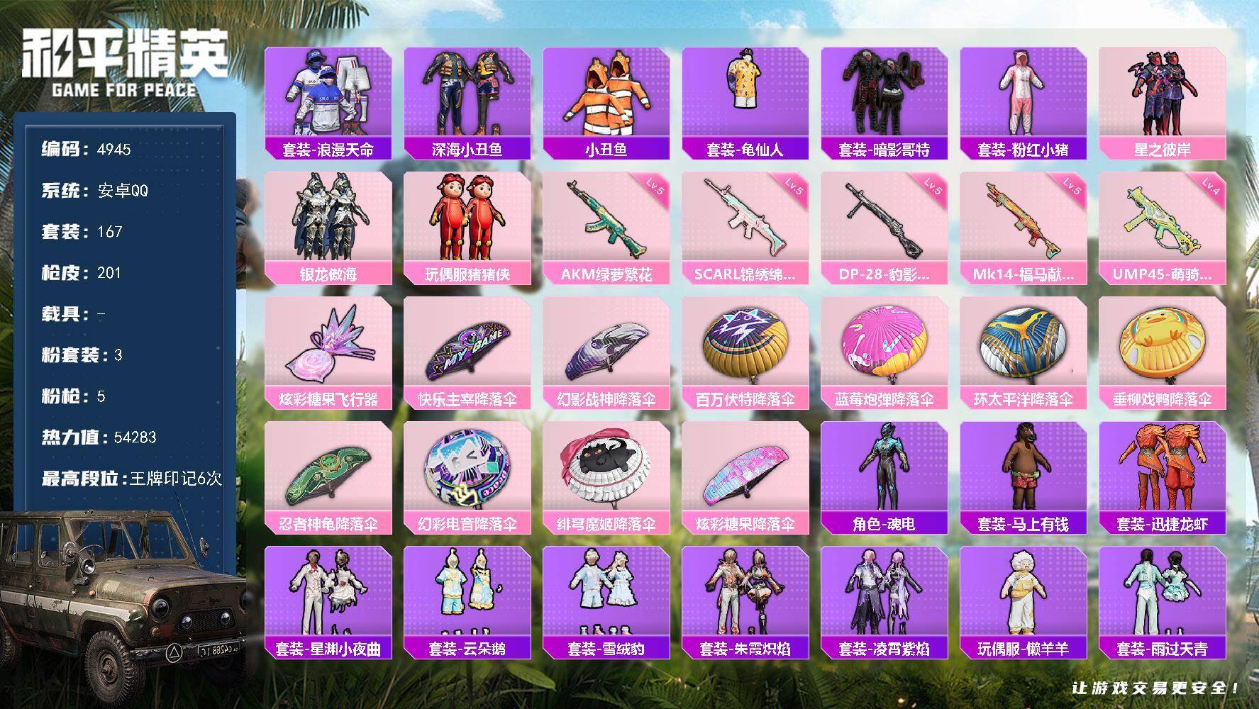 安卓 手Q-3粉装-5特效枪-0载具-1粉色飞行器-54283热力值-6王牌印记