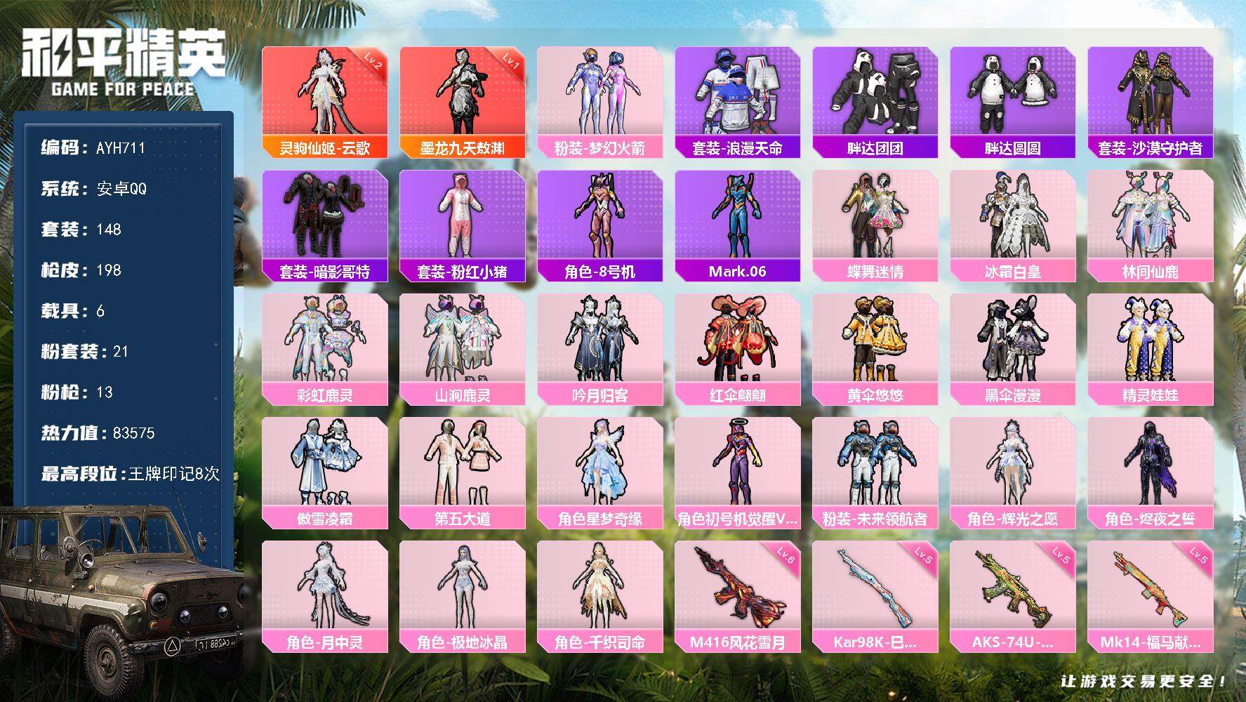 安卓 手Q-2神装-21粉装-13特效枪-6载具-13粉色飞行器-83575热力