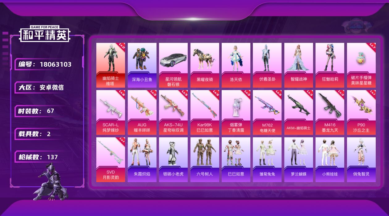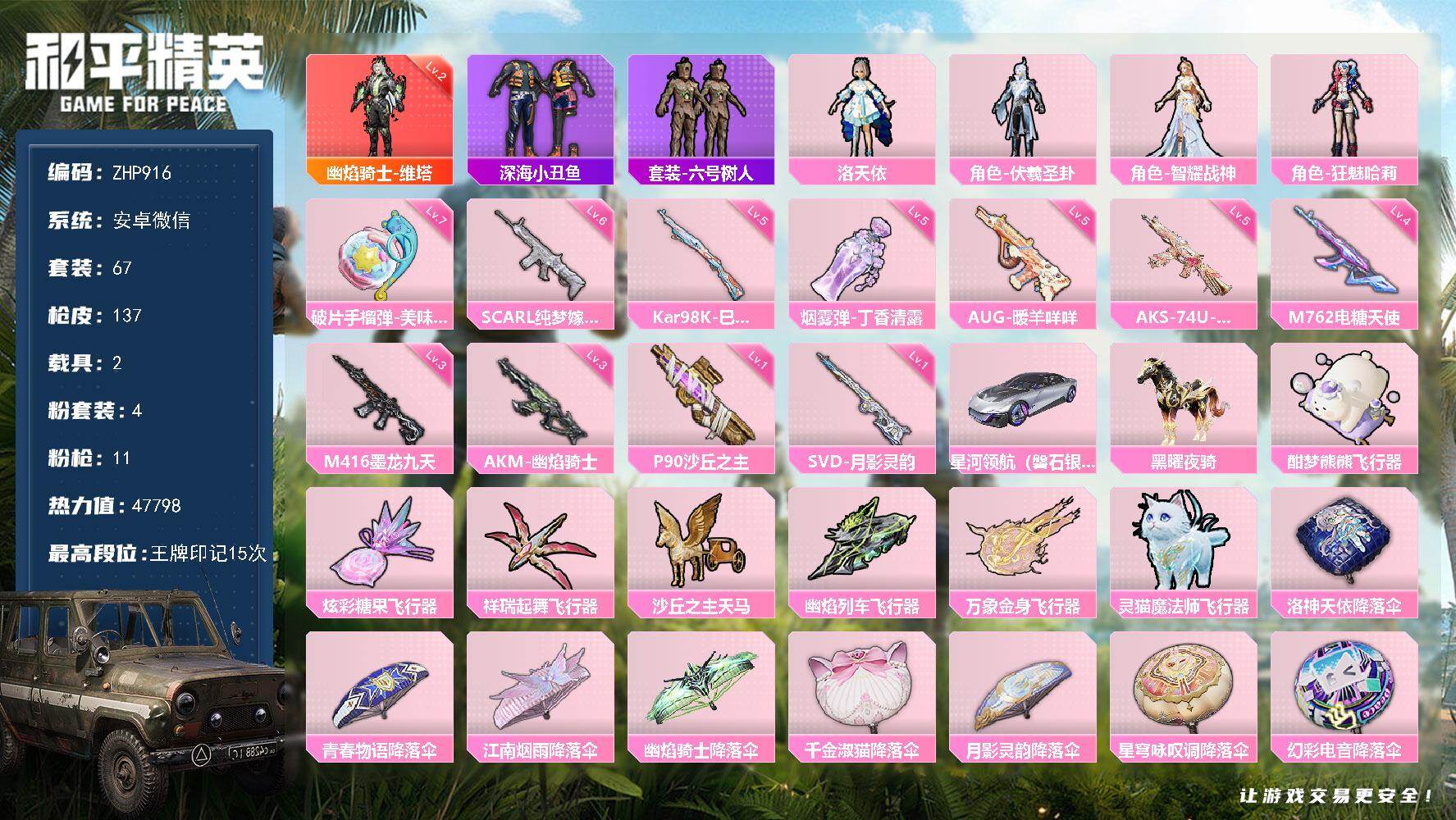 1神装-4粉装-11特效枪-2载具-7粉色飞行器-47798热力值-15王牌印记-67套装-137枪皮