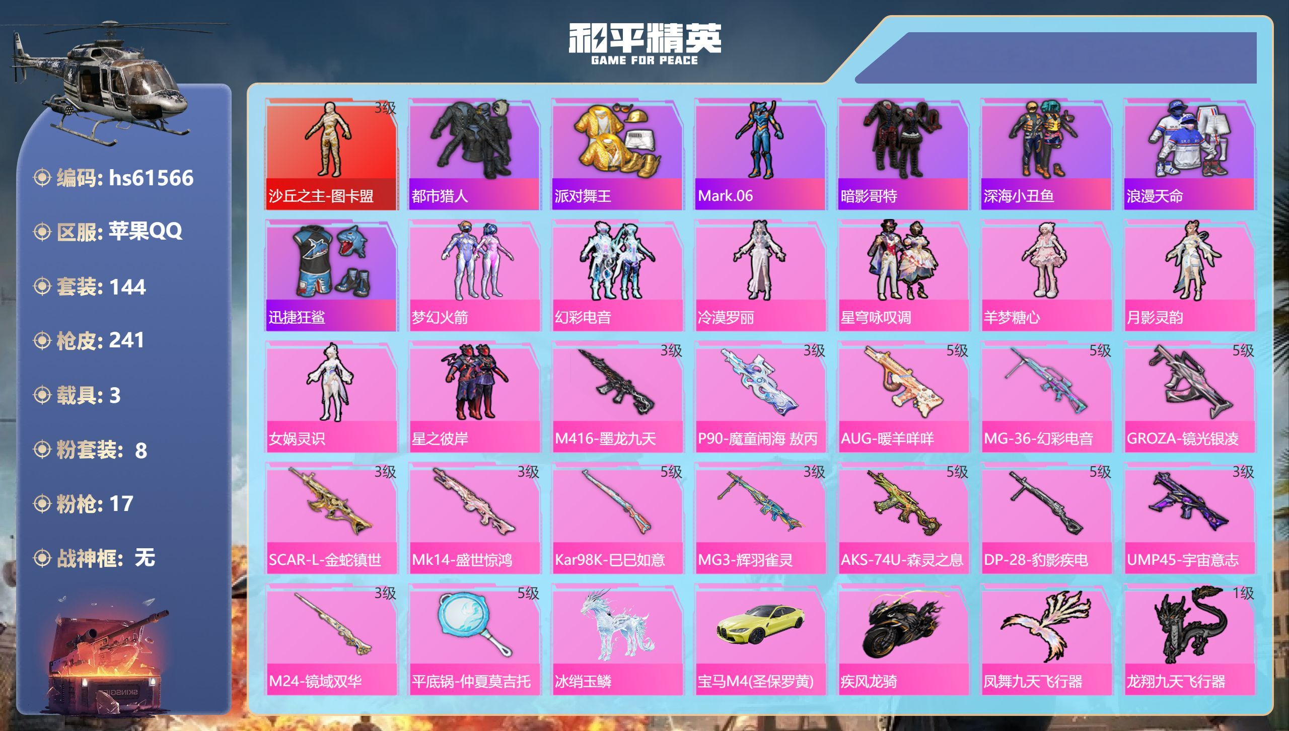 hs61566 苹果手Q-9王牌印记-1红装-8粉装-17特效枪-3载具-82412热力值-144套
